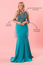 Vestido longo com elegância refinada. Possui busto todo bordado em pedrarias que formam desenhos verticais e arabescos, valorizando o tronco com brilho e sofisticação. A cintura também é realçada com detalhes bordados que se estendem até as costas, onde o recorte profundo adiciona sensualidade na medida certa. A saia fluida em corte sereia garante movimento e caimento impecável. Ideal para festas de formatura e casamentos à noite.