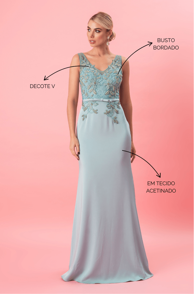 Um vestido longo que une delicadeza e sofisticação em cada detalhe. O busto em tule bordado com pedrarias realça o desenho floral e garante um toque de luminosidade elegante. O decote em ¿V¿ frontal alonga a silhueta, enquanto o decote posterior em transparência com aplicação de pontos de brilho traz sensualidade equilibrada. A saia lisa, de caimento reto e fluido, cria um visual clássico e atemporal, ideal para madrinhas e convidadas que buscam leveza e requinte.