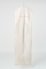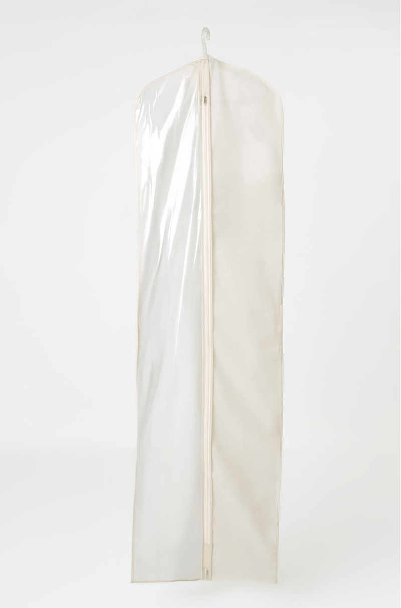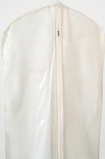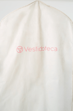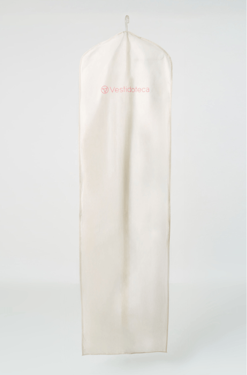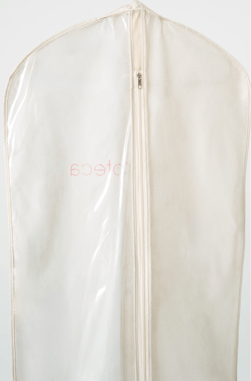 Capa protetora para vestidos de festa confeccionada em material semitransparente e resistente. A parte frontal é dividida em duas seções: uma lateral com visor de plástico transparente que permite visualizar o conteúdo sem precisar abrir, e outra em tecido opaco de cor clara, conferindo elegância e discrição. Possui fechamento frontal com zíper de cima a baixo, facilitando o manuseio e o armazenamento do vestido. O gancho superior sugere que pode ser pendurada em cabide, ideal para manter vestidos de festa protegidos contra poeira, sujeira e amassados. Perfeita para transporte e conservação de vestidos de festa.