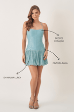 Este vestido curto em malha lurex traz um brilho discreto e elegante, perfeito para quem quer se destacar com leveza. O decote suavemente em formato de coração, acompanhado por alças finas, valoriza o colo de maneira delicada. A cintura mais baixa com recortes verticais ajuda a alongar a silhueta, enquanto a saia estilo balonê deixa o visual moderno e cheio de frescor.