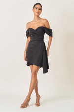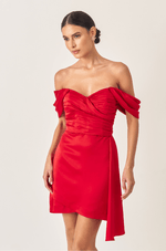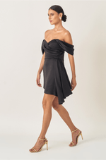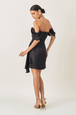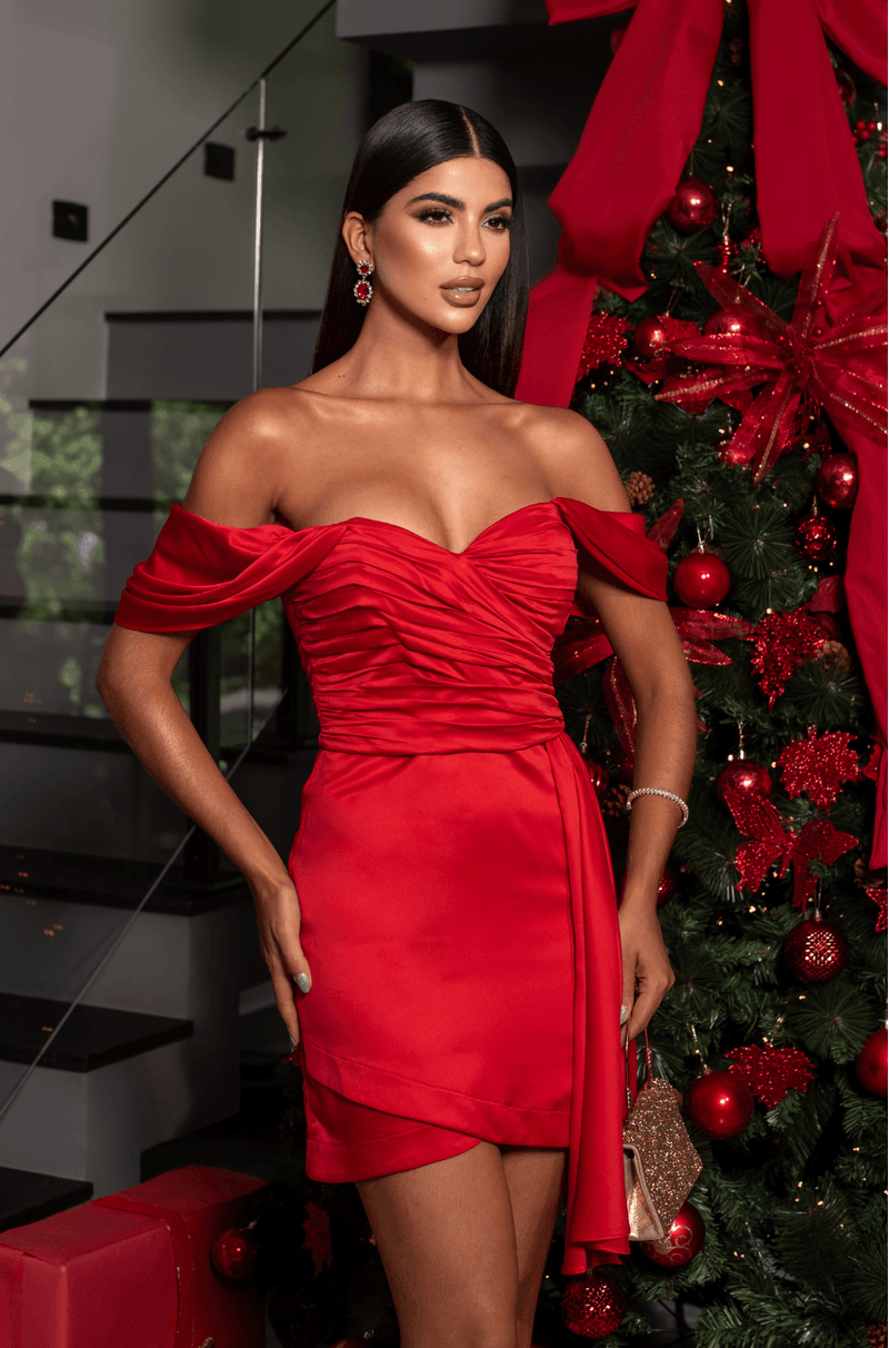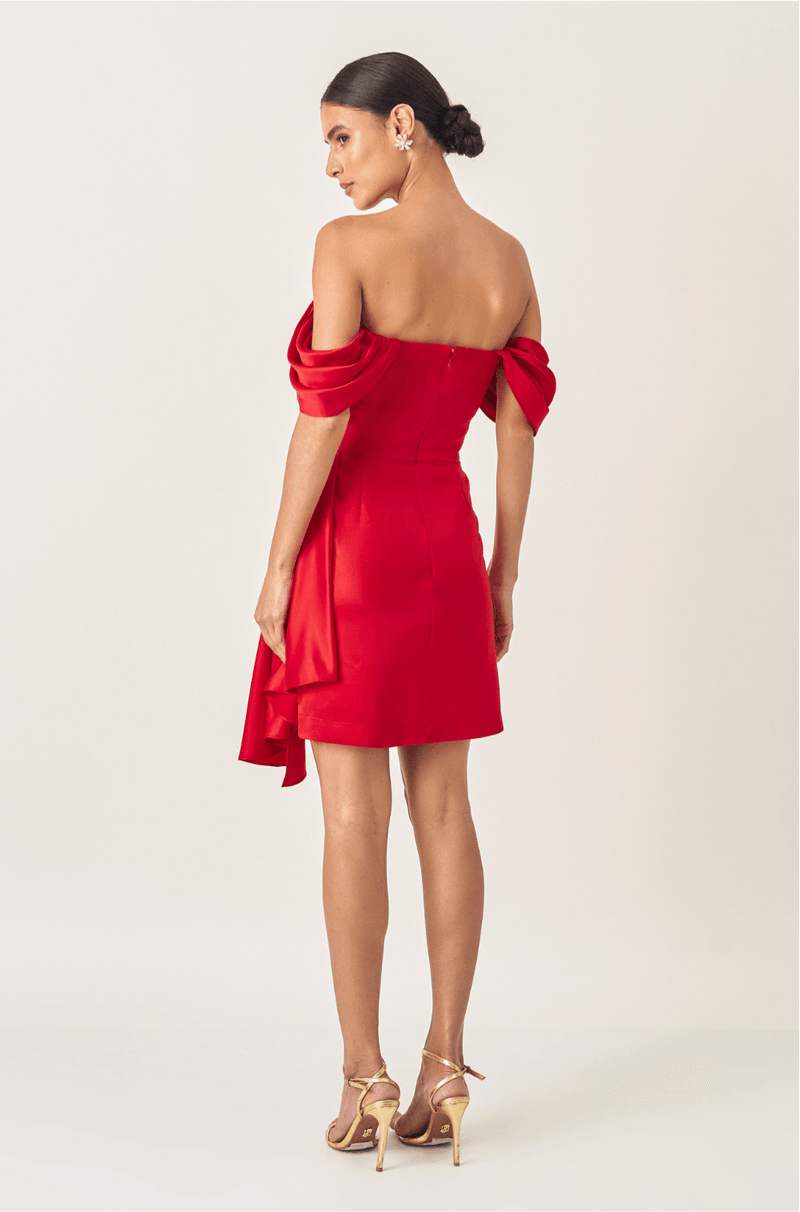 Delicado e versátil, o vestido curto em crepe acetinado combina caimento leve, brilho sutil e toque sofisticado. O decote transpassado valoriza o colo com elegância, enquanto a manga curta drapeada e o franzido no busto e na cintura moldam o corpo com suavidade, criando um visual feminino e equilibrado.
