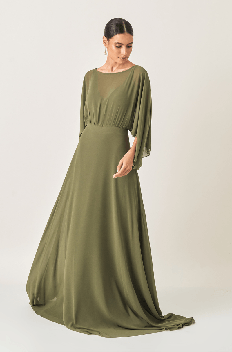 Vestido longo em chiffon com leve transparência e caimento fluido, perfeito para quem busca um visual delicado com toque etéreo. A parte frontal apresenta decote redondo e franzido sutil no busto, criando volume leve e elegante. As mangas em camadas soltas, com efeito translúcido, evocam leveza e feminilidade. A cintura marcada equilibra a silhueta, enquanto a saia levemente evasê acompanha os movimentos com charme e sofisticação.