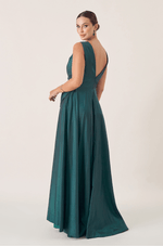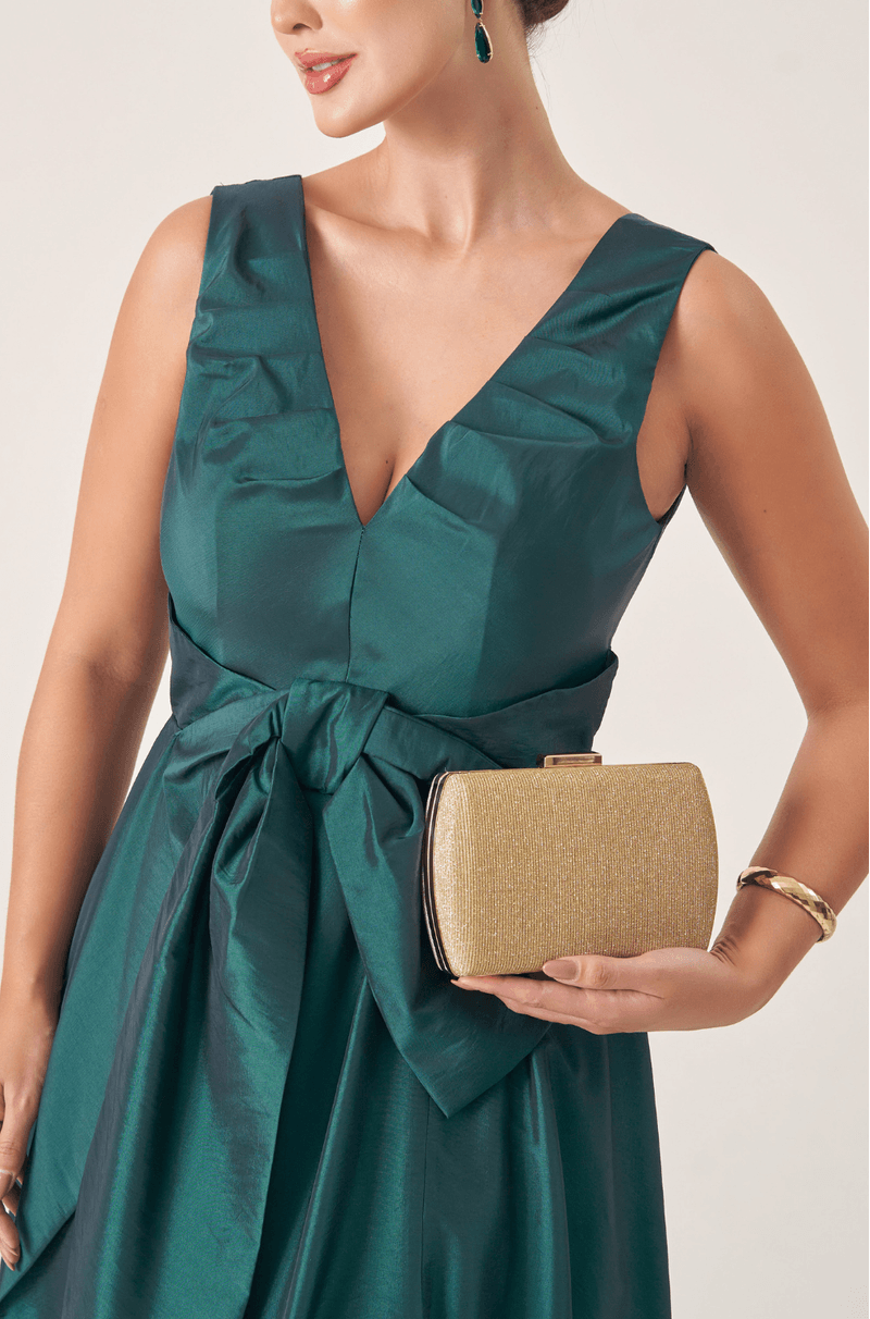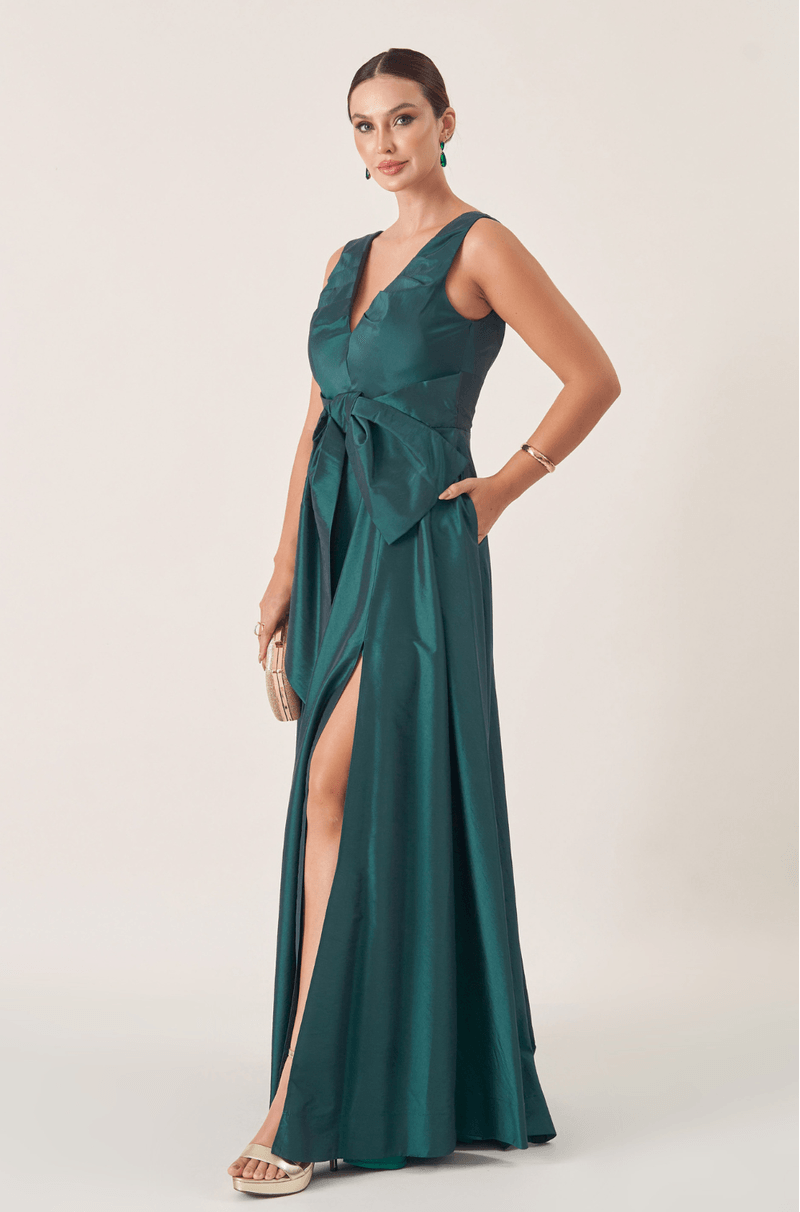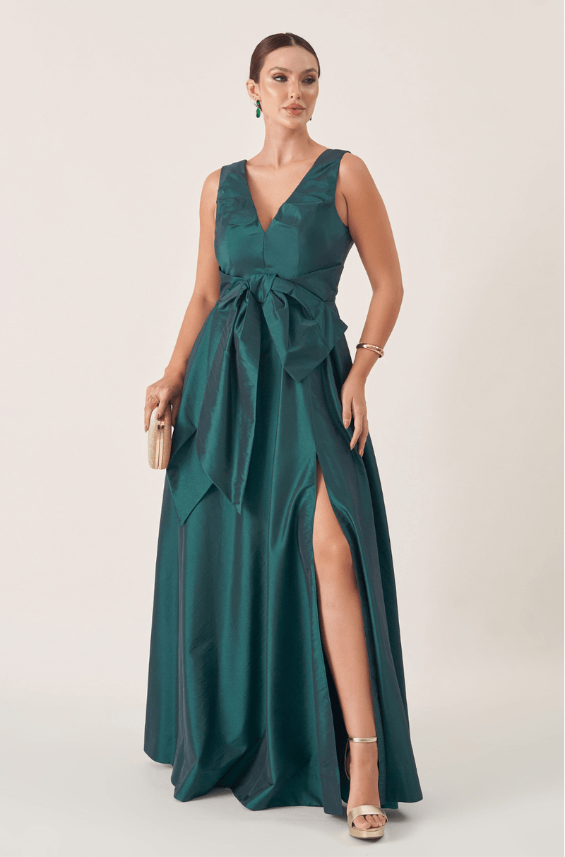 Vestido longo em tafetá que garante brilho e estrutura. O decote V com pregas adiciona textura ao busto, enquanto o laço único centralizado abaixo do busto traz um toque feminino e delicado. A saia ampla 180º com fenda lateral cria uma silhueta romântica com leveza e impacto visual. É a peça ideal para arrasar em eventos marcantes com muito estilo.