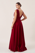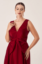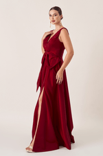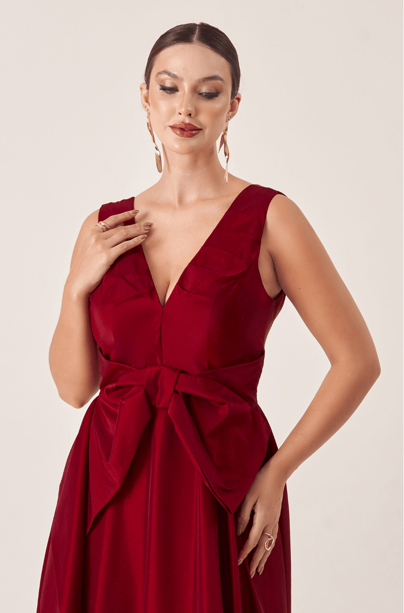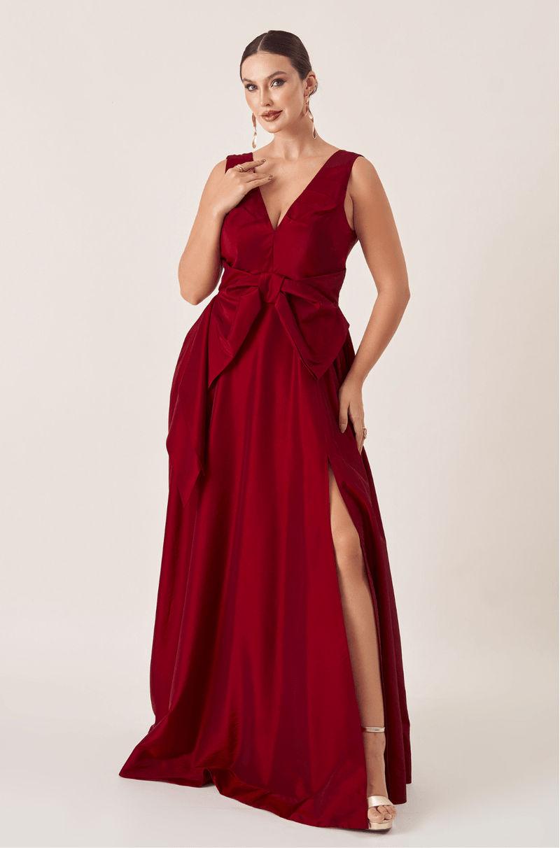 Vestido longo em tafetá que garante brilho e estrutura. O decote V com pregas adiciona textura ao busto, enquanto o laço único centralizado abaixo do busto traz um toque feminino e delicado. A saia ampla 180º com fenda lateral cria uma silhueta romântica com leveza e impacto visual. É a peça ideal para arrasar em eventos marcantes com muito estilo.