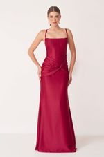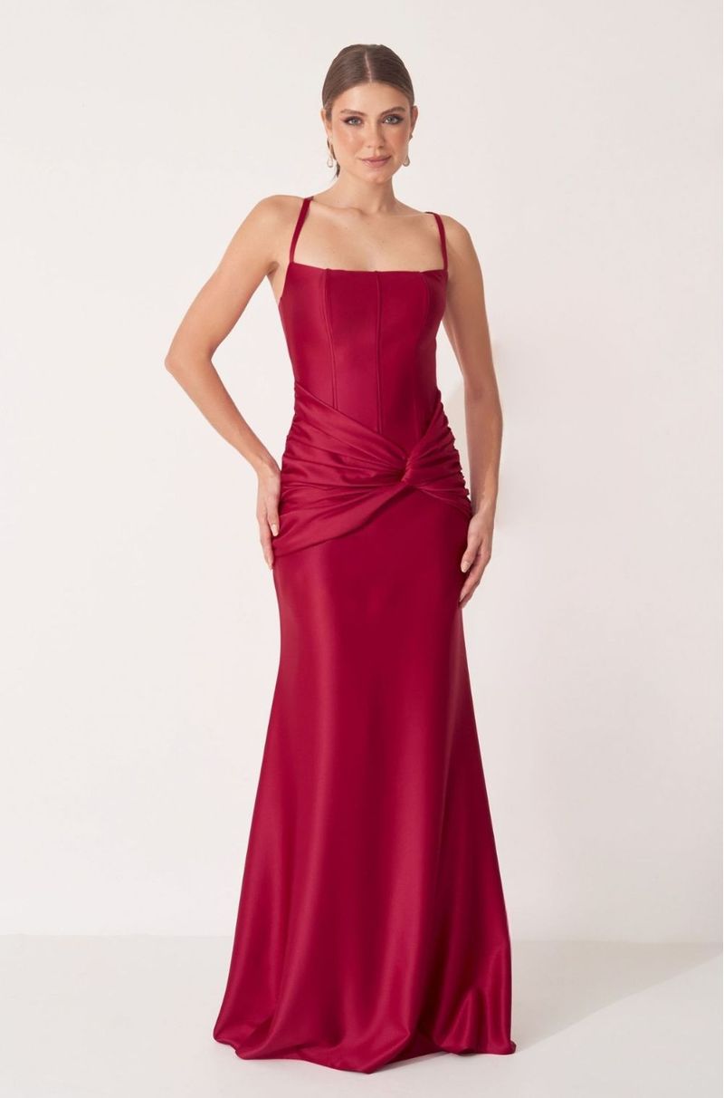 Vestido sereia com costas abertas que une sensualidade estruturada e elegância. Confeccionado em cetim, tecido que oferece brilho sutil e caimento impecável, o modelo traz um decote reto com alças finas que traz delicadeza ao visual. A cintura com barbatanas proporciona sustentação e estrutura, enquanto o detalhe torcido e franzido no quadril valoriza as curvas, criando um efeito sofisticado na silhueta. A saia sereia desenha o corpo com charme e refinamento. Nas costas, o decote profundo com amarração finaliza a peça com um toque ousado e moderno. Fechamento por zíper invisível lateral a partir do quadril.
