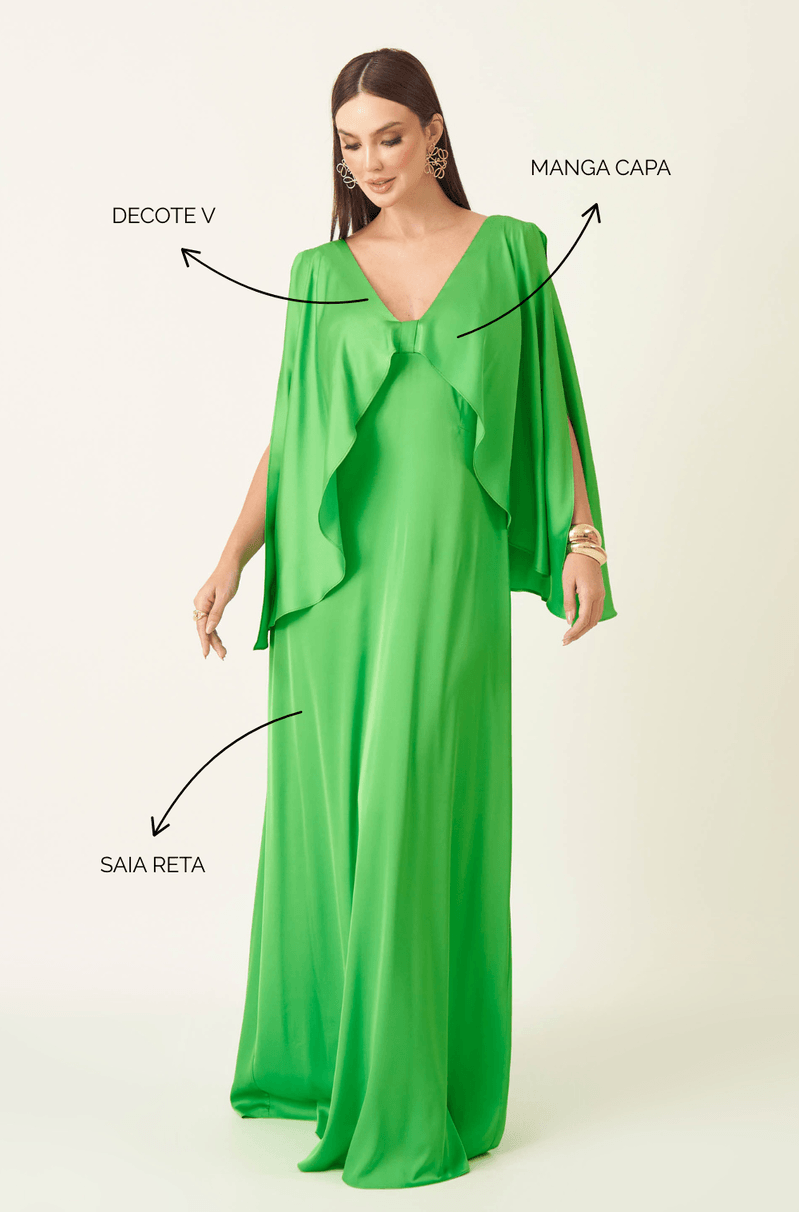 Vestido longo em silk satin que garante fluidez sofisticada. Possui sobreposição no busto em camada fluida estilo manga capa com recorte lateral, trazendo leveza e sofisticação ao visual. O decote V frente e costas garantem sensualidade na medida e a saia reta equilibra o visual. Ideal para casamentos, formaturas e eventos formais ao entardecer.
