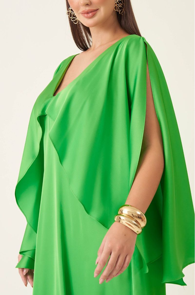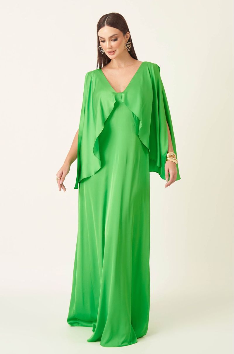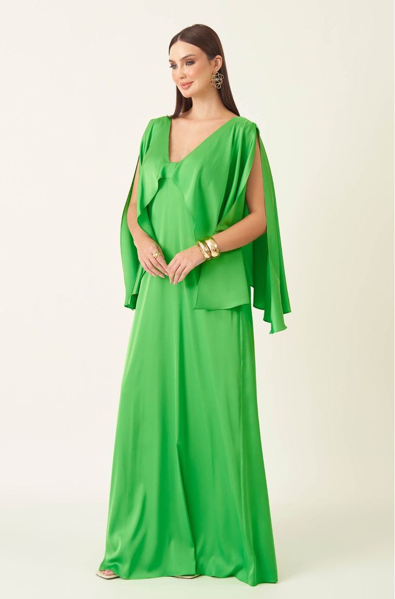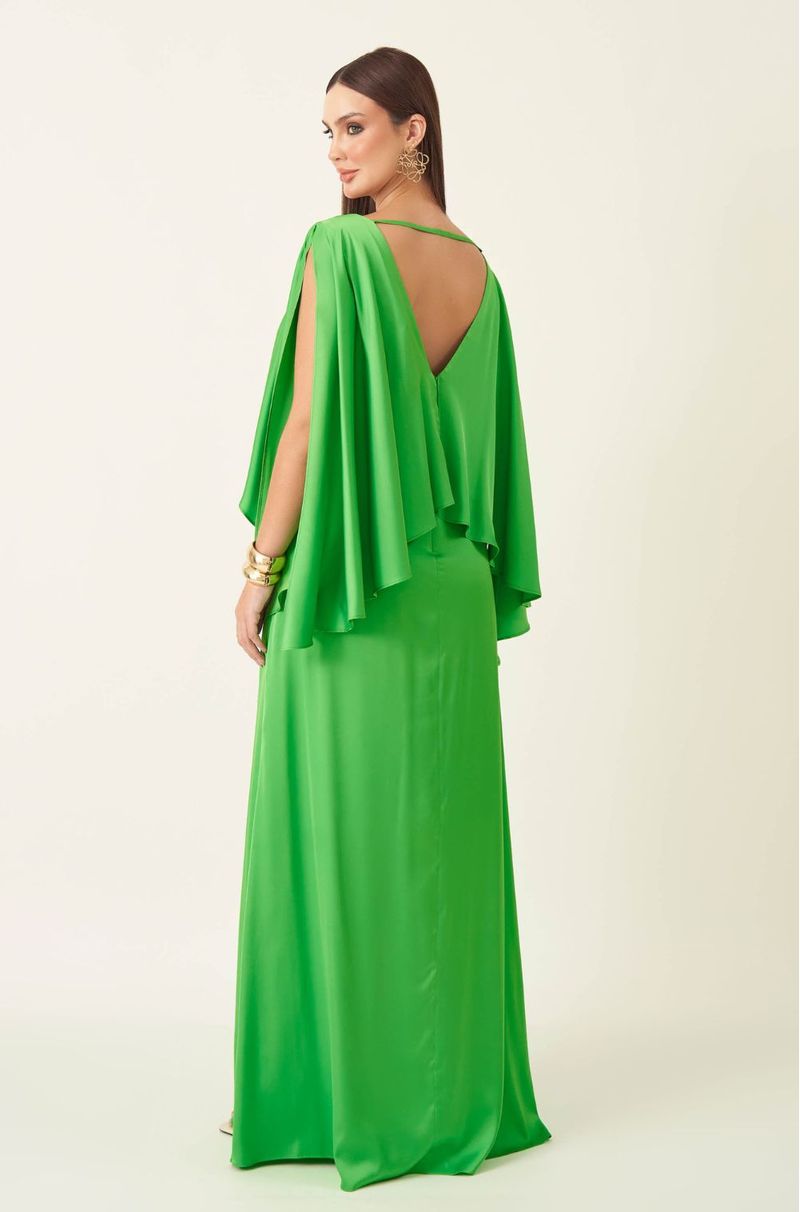 Vestido longo em silk satin que garante fluidez sofisticada. Possui sobreposição no busto em camada fluida estilo manga capa com recorte lateral, trazendo leveza e sofisticação ao visual. O decote V frente e costas garantem sensualidade na medida e a saia reta equilibra o visual. Ideal para casamentos, formaturas e eventos formais ao entardecer.