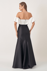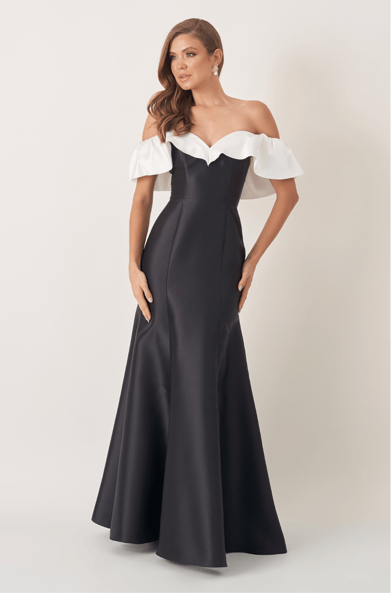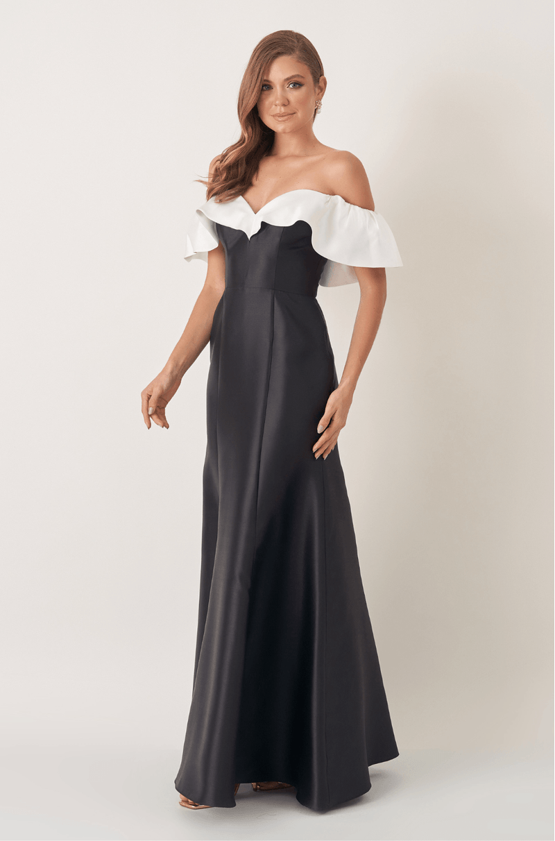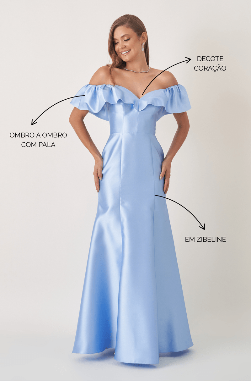 Vestido longo em zibeline encorpado, com caimento estruturado e elegante. O decote coração valoriza o colo, enquanto a manga ombro a ombro ganha destaque com pala sobreposta e babados que criam movimento. A saia sereia com recorte vertical modela a silhueta com sofisticação. Zíper invisível no centro das costas garante acabamento impecável.