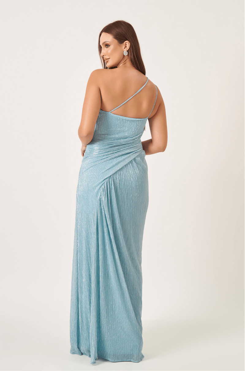 Ombro único com alça dupla delicada que traz sustentação sem pesar no visual. Cintura ajustada com franzidos na diagonal que valorizam a silhueta e fenda lateral poderosa. Modelo que garante brilho e presença para formandas ou convidadas.