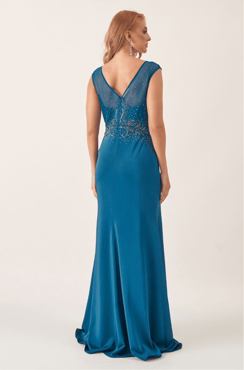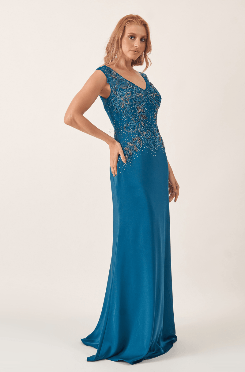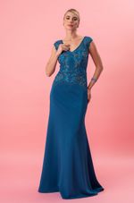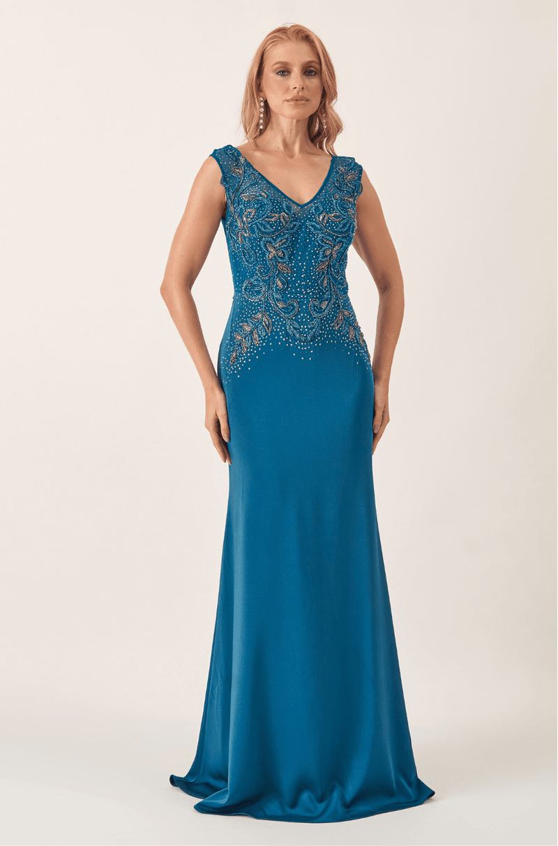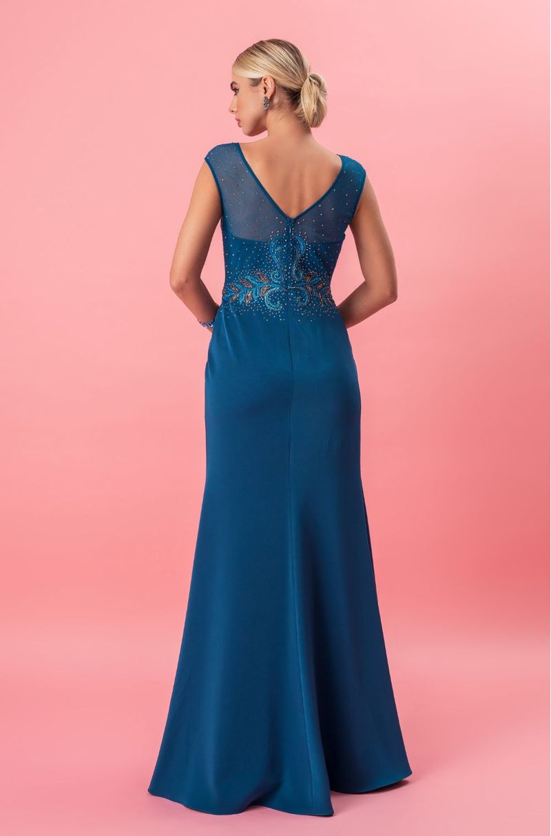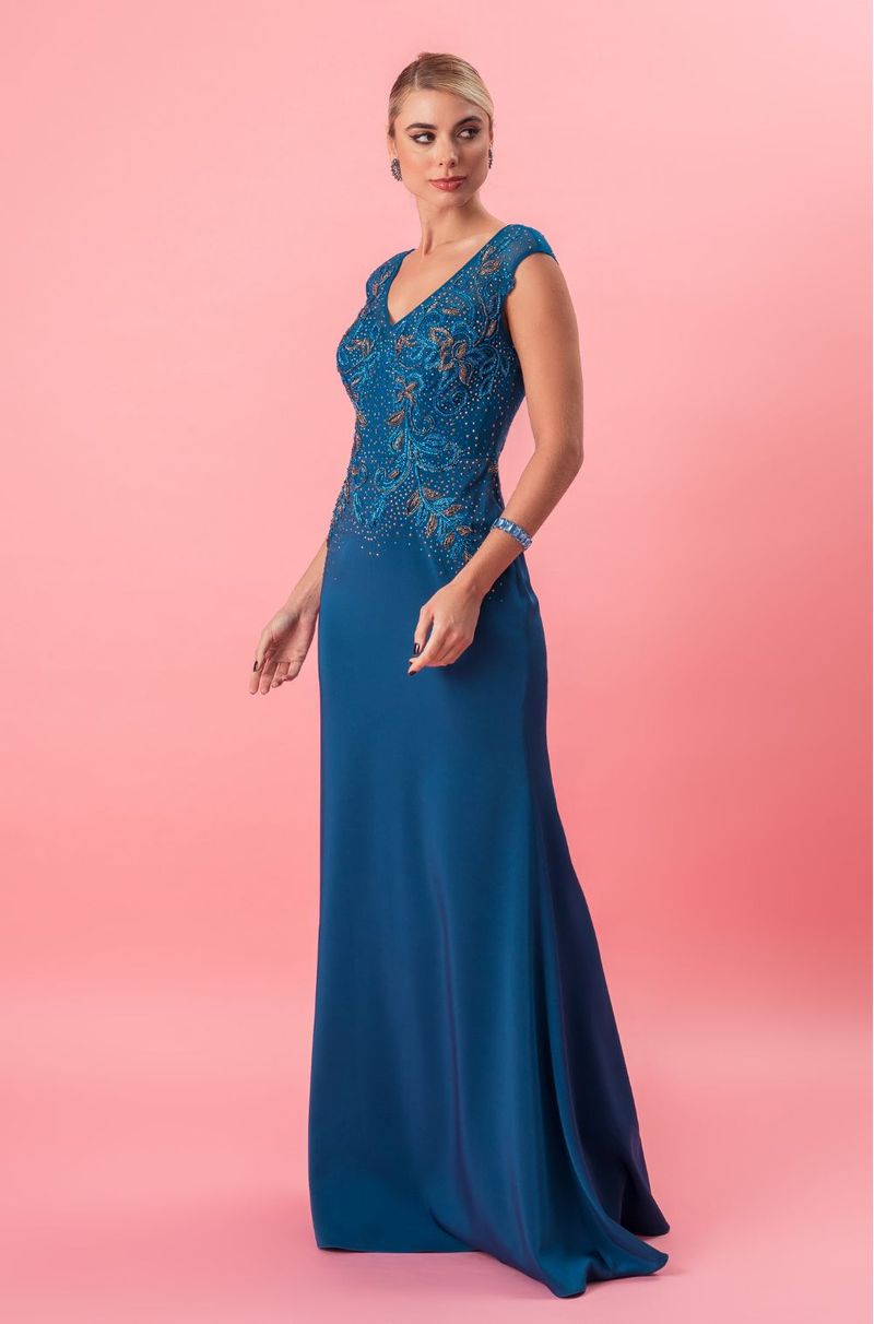 Longo em malha com bordado artesanal criando um efeito visual precioso. O decote V frontal valoriza o colo com elegância, emoldurado por mangas em tule bordado. Nas costas, o decote em V com transparência revela detalhes bordados com sutileza e delicadeza. A cintura é desenhada por arabescos de pedrarias, que afinam e destacam a silhueta. A saia longa acompanha o corpo suavemente, com leve abertura na barra. Ideal para casamentos à noite, formaturas ou eventos de gala.