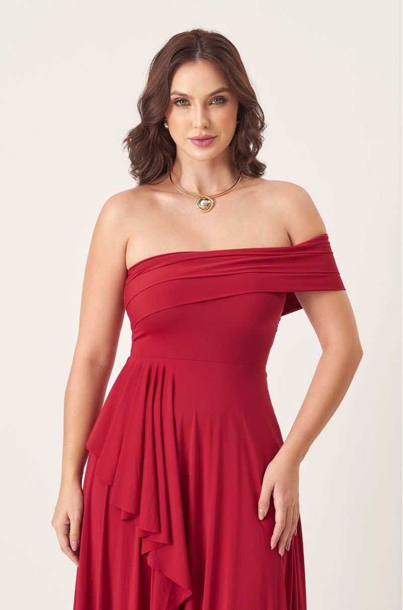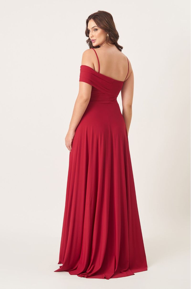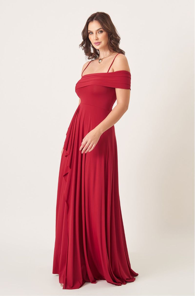 Vestido longo em malha fluida com toque macio e caimento leve. Alças finas removíveis e busto drapeado que segue assimetricamente por um dos ombros. A cintura é suavemente marcada, trazendo equilíbrio à silhueta. Saia transpassada com camada superior em cascata, criando movimento e sofisticação a cada passo.
