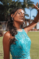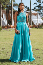 Vestido longo em chiffon com bordado no busto que encanta com seu visual leve e sofisticado. O busto é ricamente bordado em pedrarias com desenho de arabescos, criando um efeito impactante e delicado ao mesmo tempo. O decote frente alta valoriza o colo, enquanto as costas nadador trazem um toque contemporâneo. A saia fluida em chiffon com modelagem evasê proporciona movimento e leveza, ideal para dançar e celebrar. Possui zíper invisível no centro das costas. Ideal para madrinhas, formandas e eventos ao ar livre.