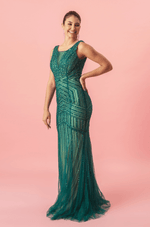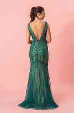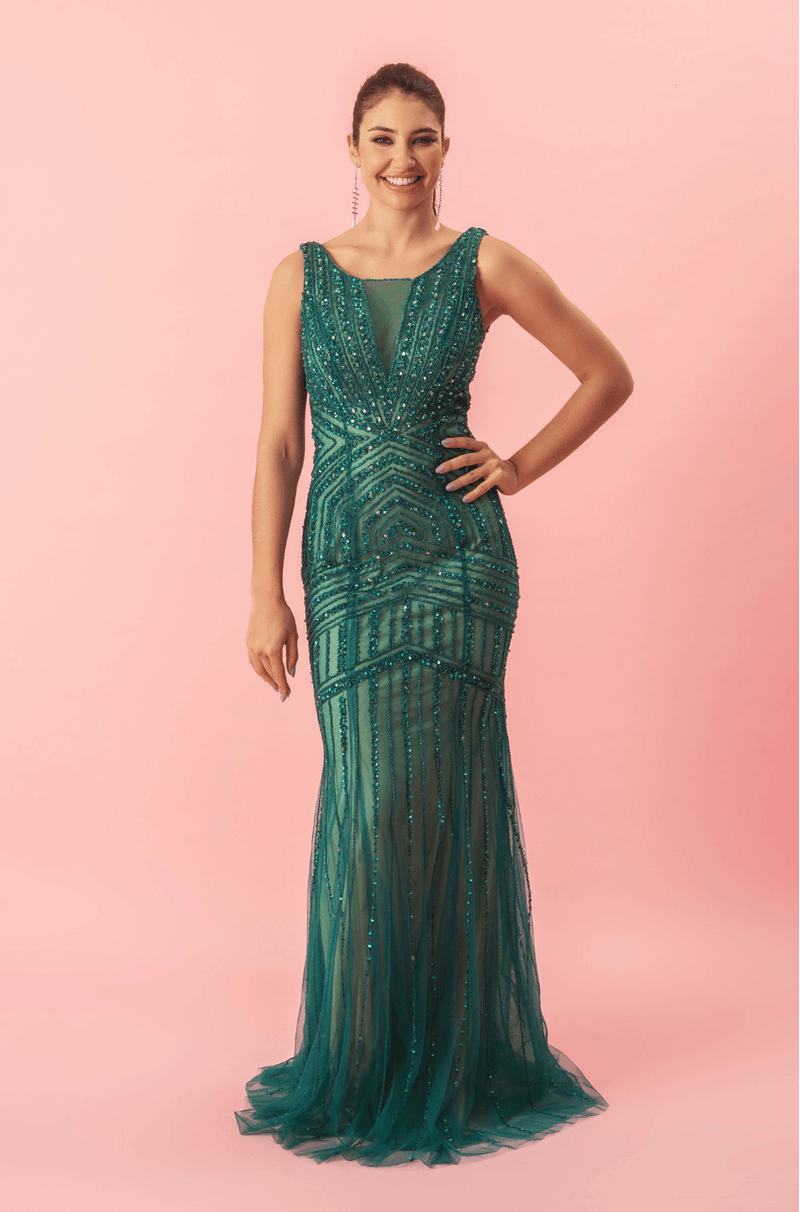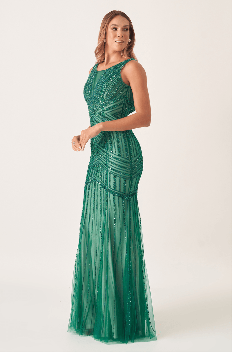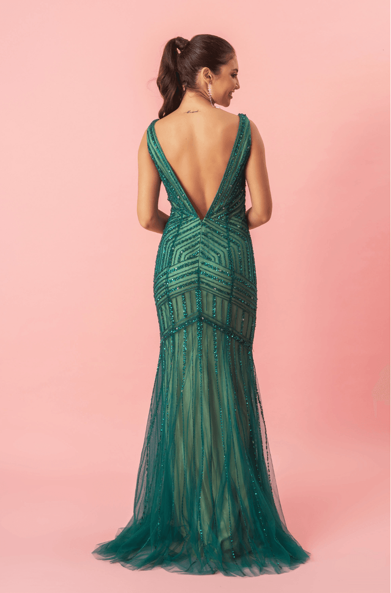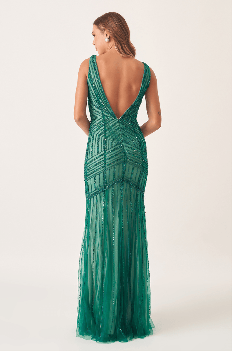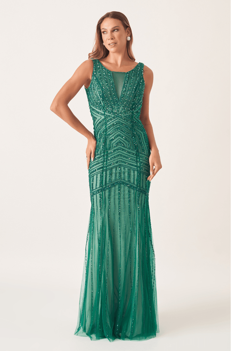 Vestido longo em tule bordado com pedrarias em padrão geométrico, ideal para quem busca um visual sofisticado e impactante. O decote em V frontal com tule ilusion alonga a silhueta, enquanto o decote profundo nas costas garante um toque de sensualidade elegante. A modelagem reta com leve evasê valoriza as curvas com sutileza. Uma escolha perfeita para madrinhas, formandas ou convidadas de eventos de gala.