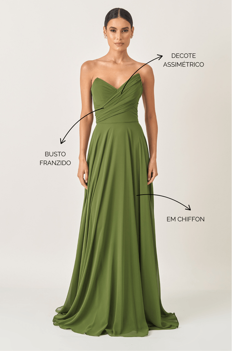 O destaque fica por conta do decote sem alças com design assimétrico: uma faixa cruzada com franzidos que valoriza a parte de cima do corpo e garante um visual atual e marcante. A saia rodada completa o look com muito movimento ¿ ótima para dançar, caminhar com leveza e se sentir incrível.