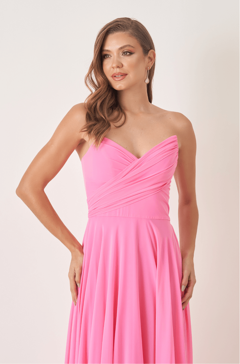O destaque fica por conta do decote sem alças com design assimétrico: uma faixa cruzada com franzidos que valoriza a parte de cima do corpo e garante um visual atual e marcante. A saia rodada completa o look com muito movimento ¿ ótima para dançar, caminhar com leveza e se sentir incrível.