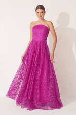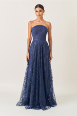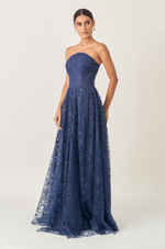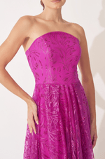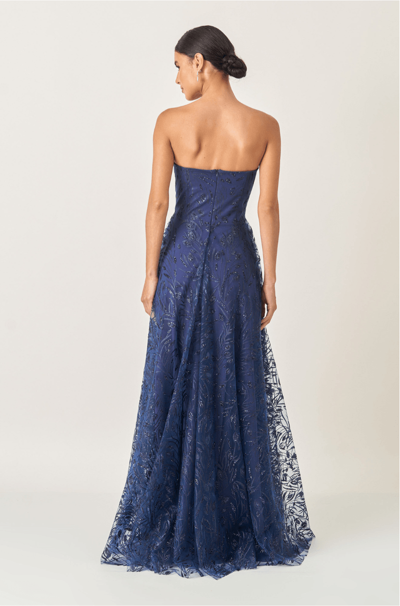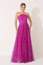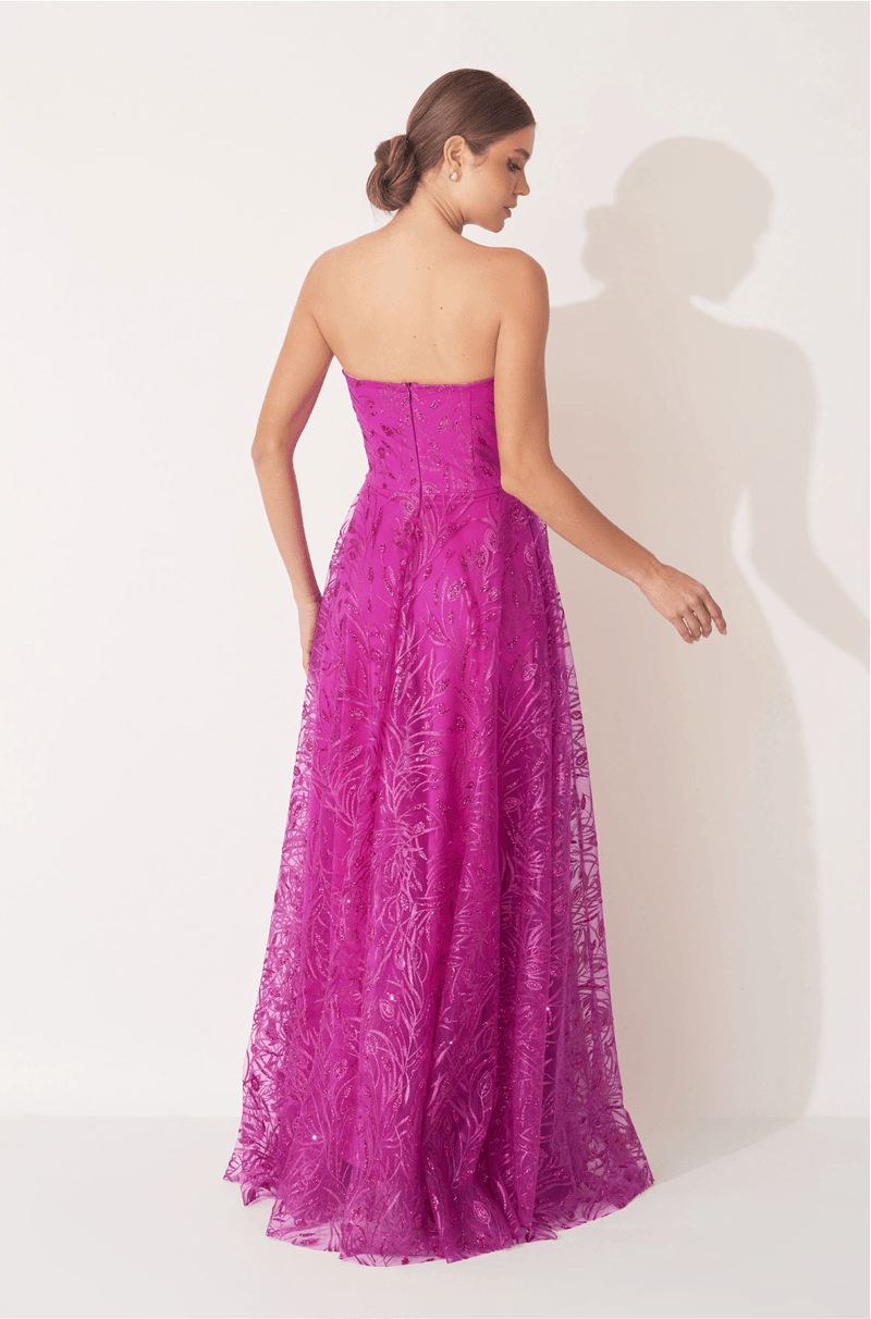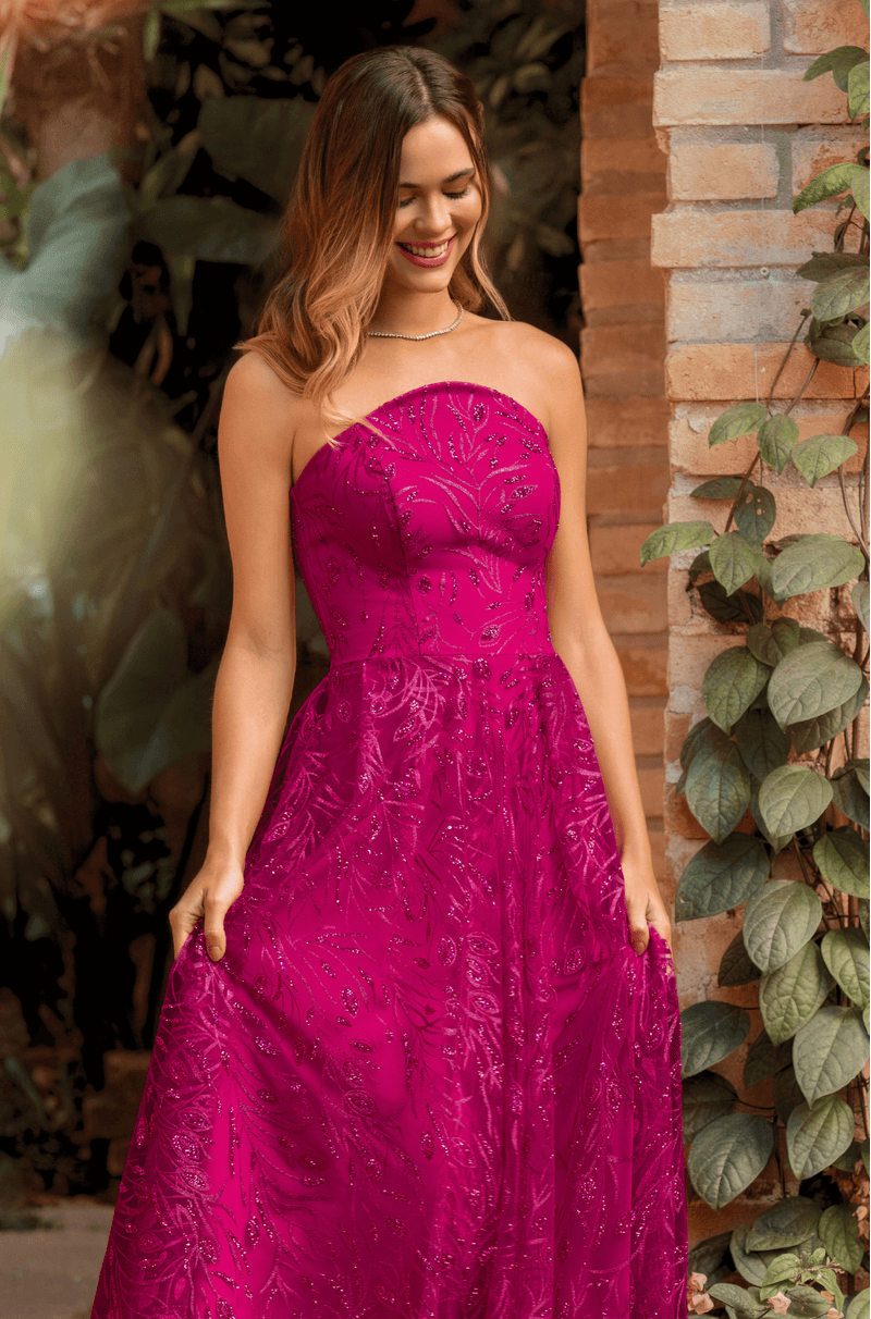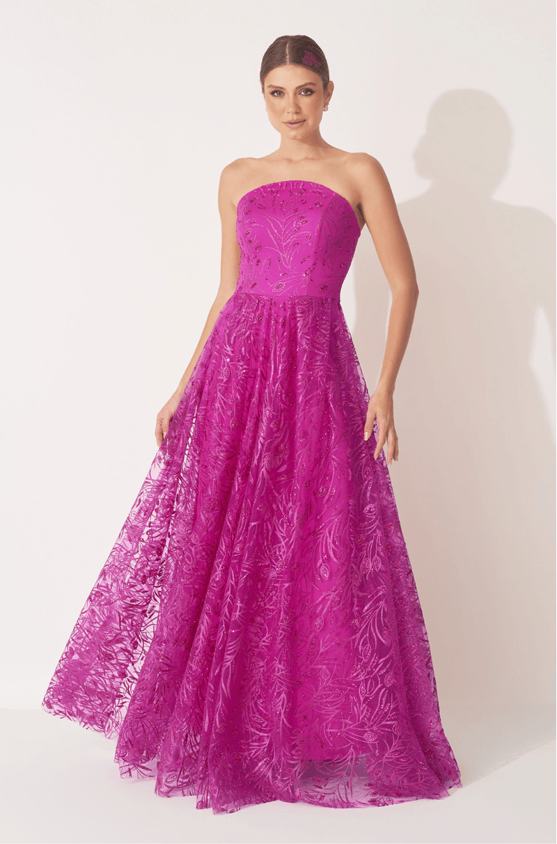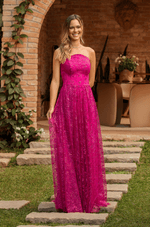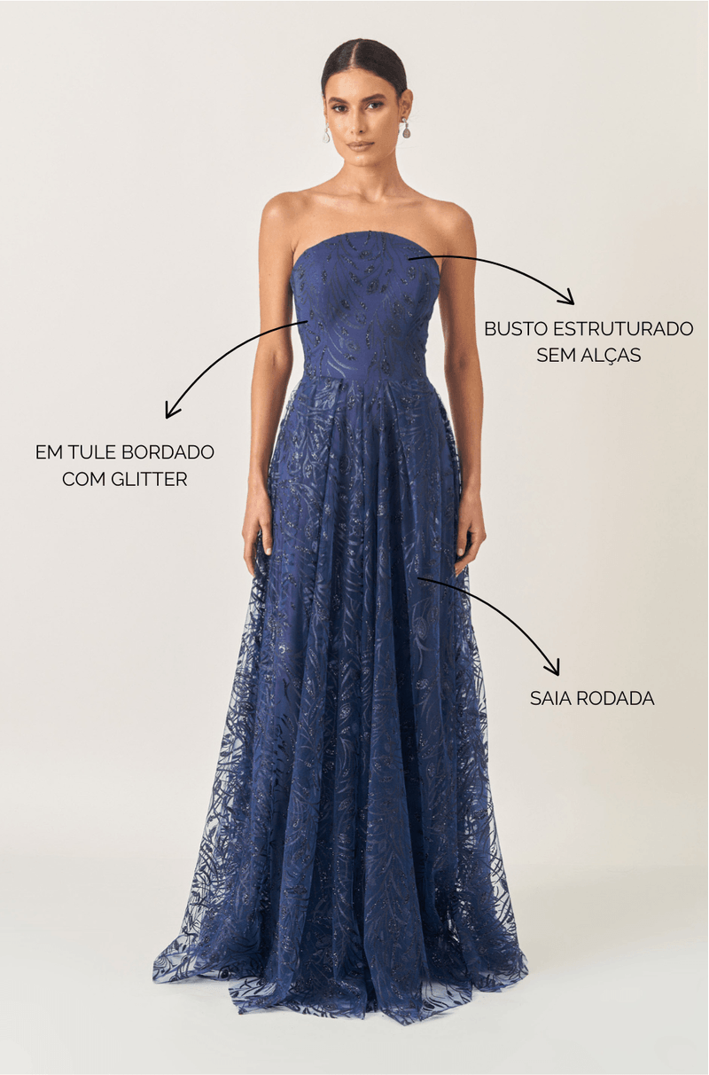 Deslumbre em qualquer ocasião com este vestido longo em tule bordado de glitter, que combina brilho, leveza e movimento em um só look. O decote estruturado sem alças valoriza o colo com elegância, enquanto o recorte central arredondado adiciona um toque moderno e feminino.