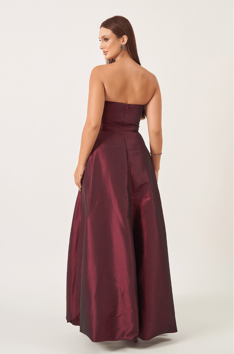 Vestido de comprimento mullet confeccionado em tafetá que traz brilho e volume. Decote sem alças com laço centralizado e cintura marcada garantindo um visual feminino. Saia mullet, midi na frente e longa atrás, e balonê que traz um toque fashion para a peça. Modelo jovial e moderno perfeito para brilhar em festas de 15 anos.