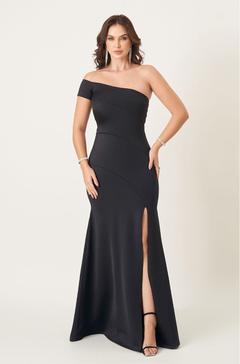 Este vestido longo traz um design moderno e sofisticado, perfeito para destacar a beleza feminina. O decote de um ombro só adiciona um toque de charme assimétrico, enquanto as mangas curtas equilibram o visual com delicadeza. Os recortes curvos na transversal valorizam as curvas naturais do corpo, criando uma silhueta harmoniosa e elegante.