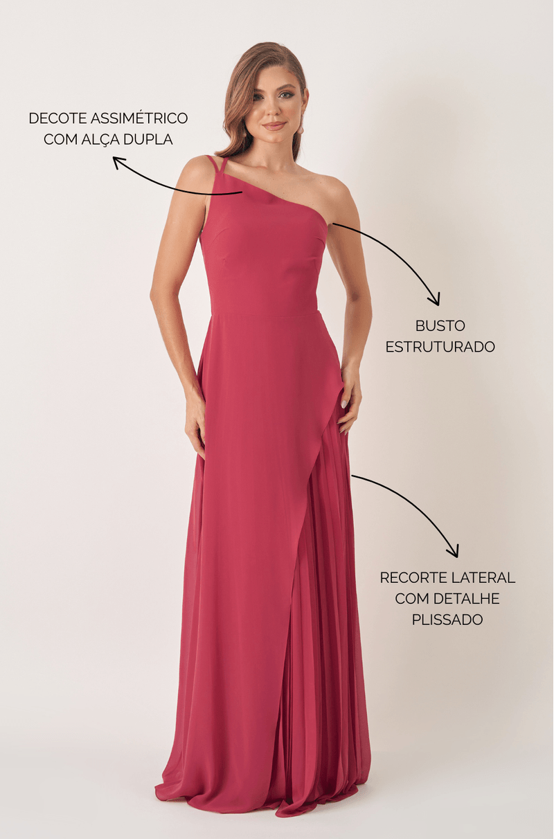 Se você ama um clássico com aquela pitada de modernidade, esse vestido longo em chiffon é a escolha certa! O decote assimétrico com alça dupla destaca os ombros e o colo com muita sofisticação, dando um charme extra ao visual.