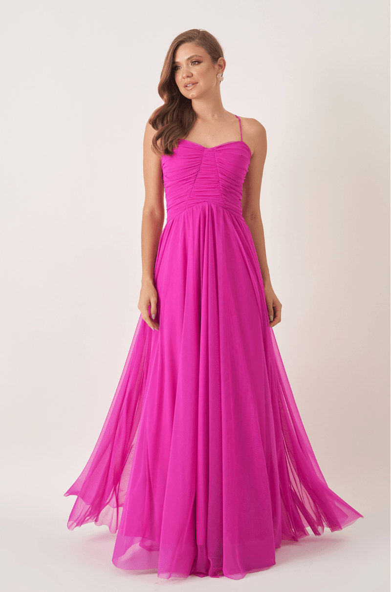 Se você procura um vestido que combine delicadeza e movimento, esse longo em tule liso é a escolha perfeita. O decote levemente coração com alças finas valoriza o colo com sutileza, enquanto o franzido no busto cria textura e define a silhueta com charme. Nas costas, a amarração cruzada em tiras finas traz uma pitada de sensualidade na medida certa. A saia rodada 360º garante amplitude e um movimento super leve, ideal para eventos ao ar livre ou festas românticas como casamentos no campo e formaturas elegantes.