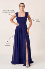 Vestido longo em chiffon com toque leve e caimento fluido. Decote reto com delicado franzido no busto e alça larga embutida, que garante sustentação e elegância. Nas costas, decote V e zíper invisível central. A saia rodada ganha ainda mais movimento com a fenda frontal na perna, criando um visual impactante e sofisticado. Perfeito para madrinhas, convidadas de gala e formandas.