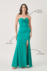 Estrutura e delicadeza definem este vestido longo em tafetá, perfeito para quem busca um visual feminino e sofisticado. O decote sem alças com busto franzido em formato coração realça o colo com charme, enquanto o franzido na cintura, tanto na frente quanto nas costas, valoriza as curvas com sutileza. A saia sereia com fenda frontal adiciona movimento e uma sensualidade equilibrada, ideal para ocasiões especiais que pedem presença marcante.
