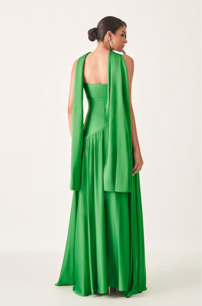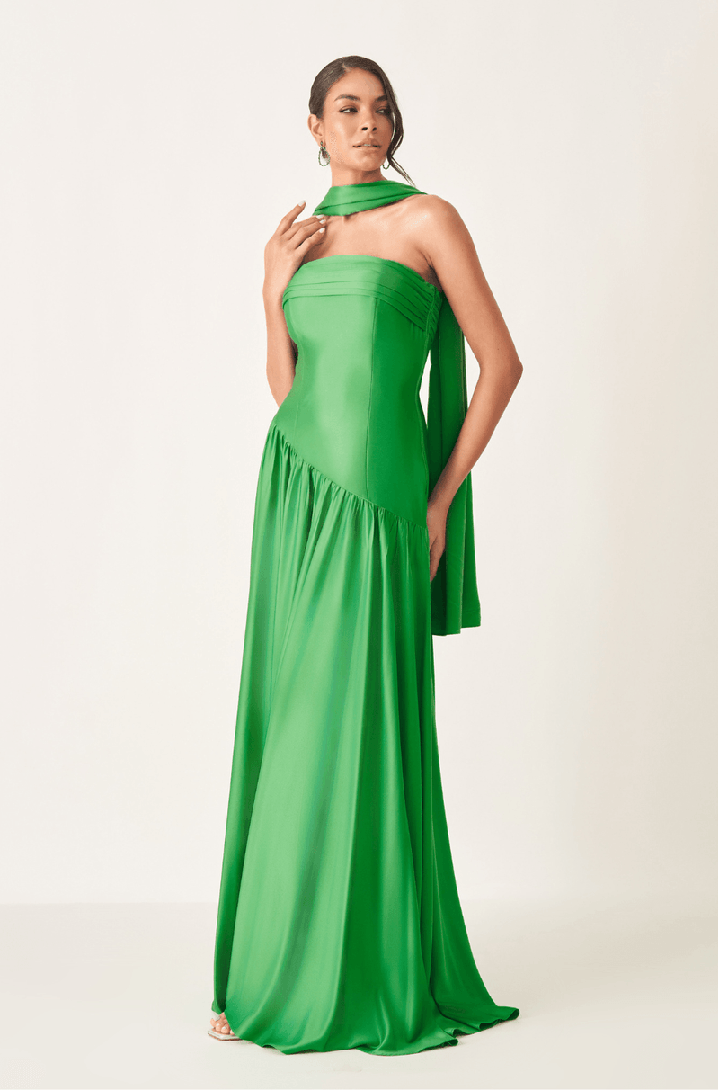 Longo em crepe acetinado, esse vestido tem aquele brilho sutil que desliza pelo corpo e entrega elegância de imediato. O decote sem alças aparece bem estruturado, acompanhado por uma pala sobreposta com franzidos leves e vincos delicados, criando textura e um destaque lindo no busto. Na cintura, o recorte diagonal alonga a silhueta de forma natural e guia o olhar até a saia rodada, fluida e ampla, que se movimenta de um jeito impecável a cada passo. Nas costas, o zíper invisível central garante um acabamento limpo. Um vestido perfeito para quem busca presença, leveza e um toque de sofisticação moderna em formaturas e casamentos.