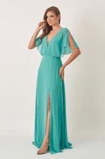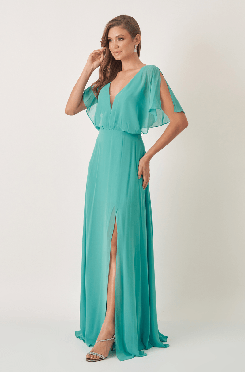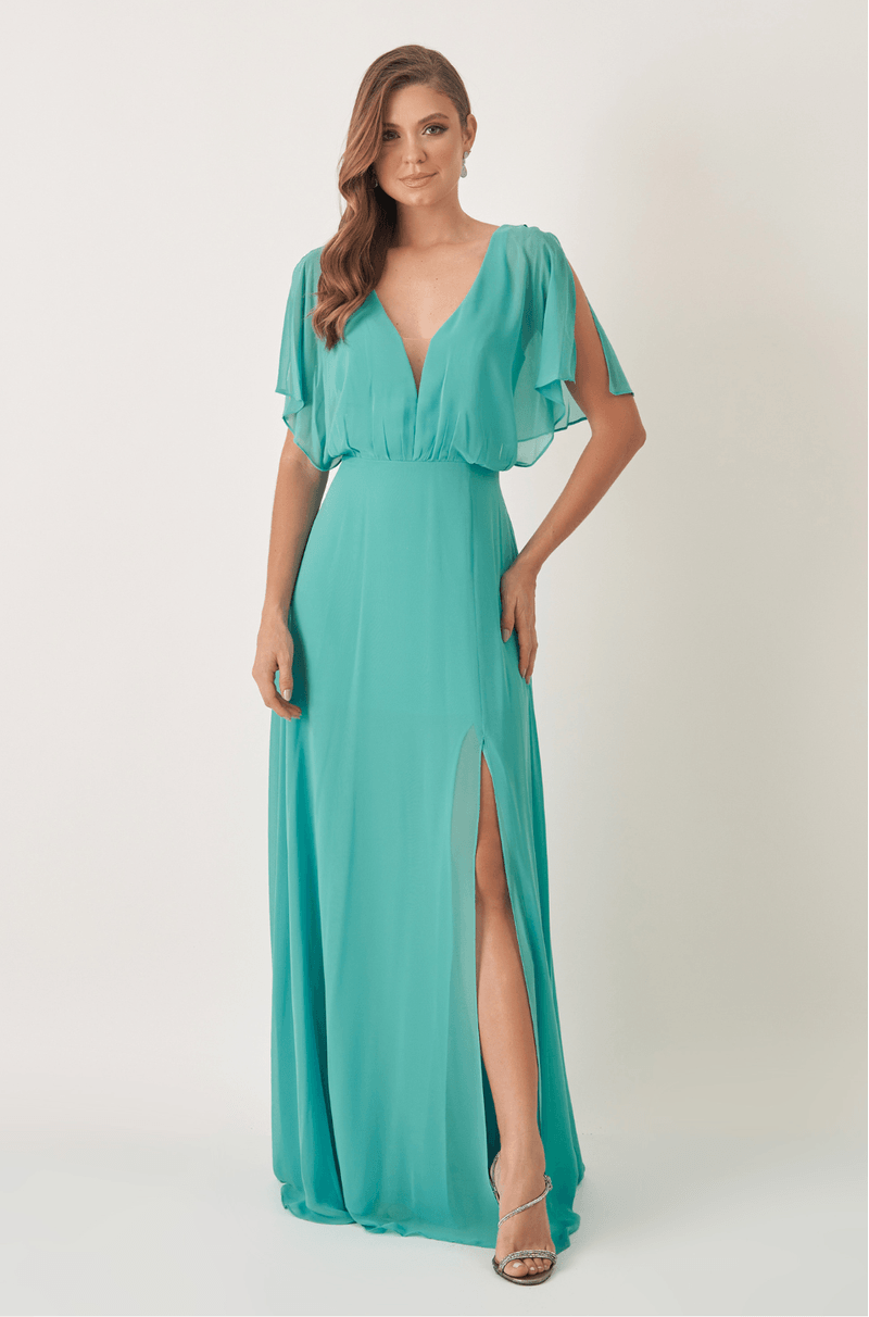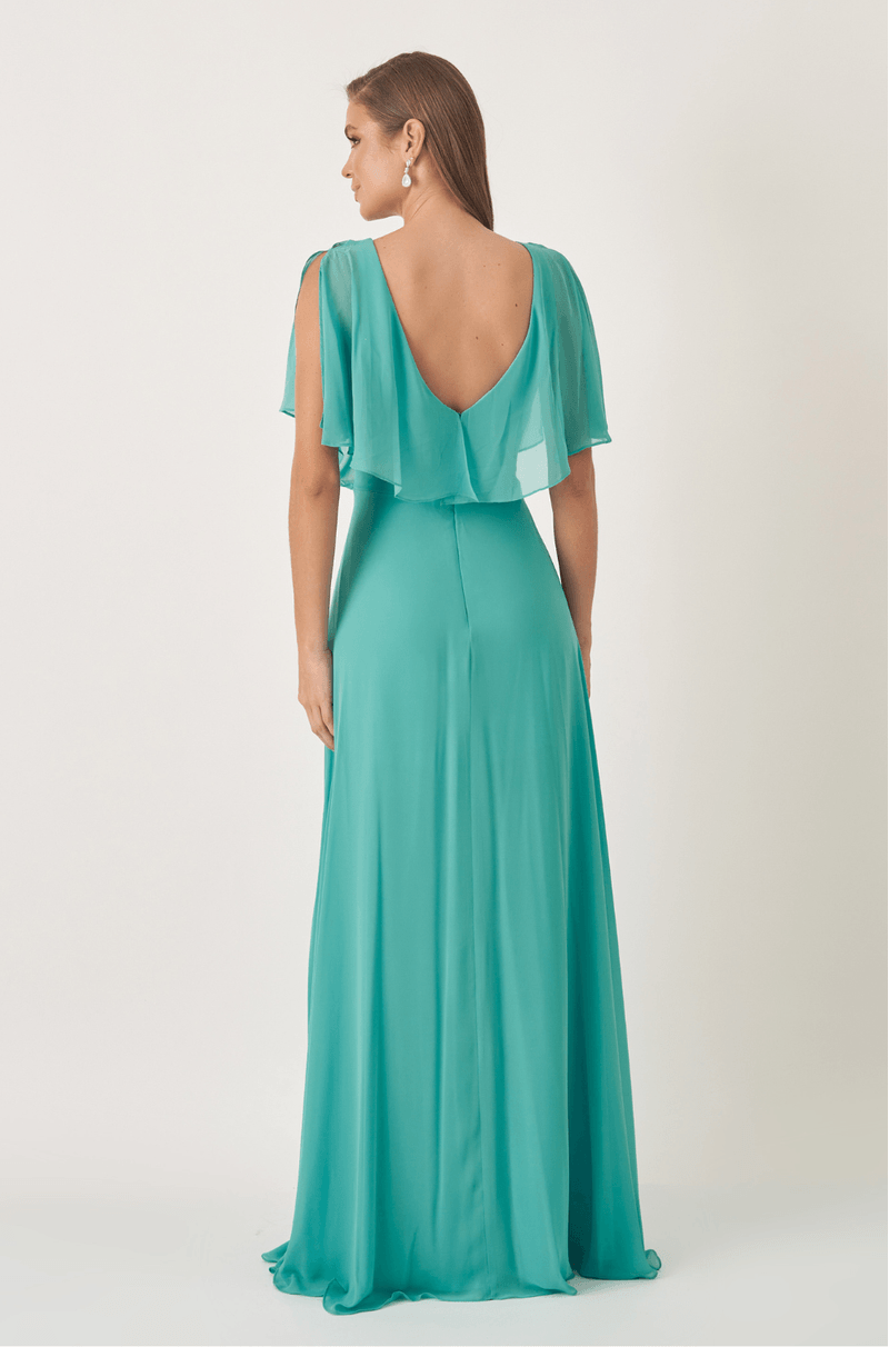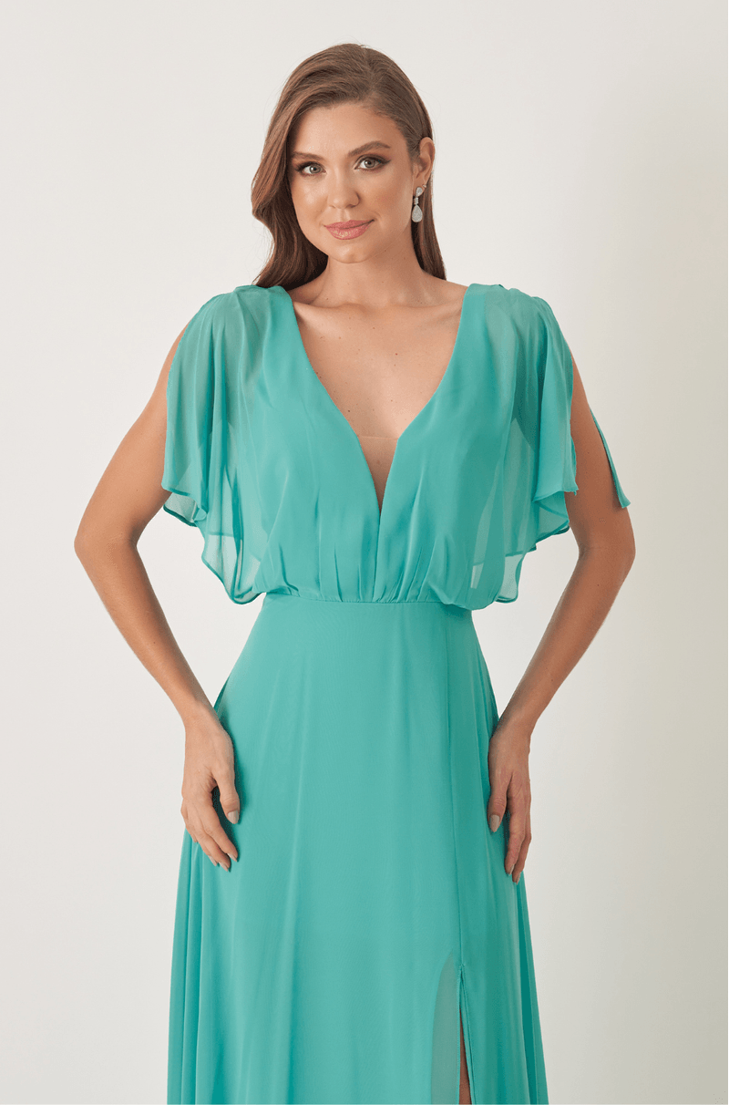 Se você busca um vestido longo que une leveza e charme, esse modelo em chiffon é a escolha certa! O decote V profundo com detalhe em tule illusion traz um toque delicado e moderno, enquanto a capinha fluida que se prolonga pelos ombros forma mangas tipo morcego super elegantes e cheias de romantismo.