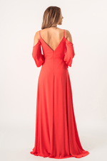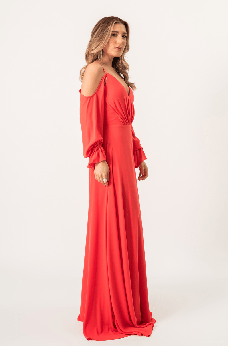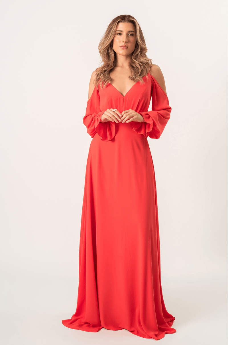 Vestido longo em chiffon com saia 180°, que garante leveza e movimento. Alças finas e mangas longas bufantes, com caimento aberto nos ombros, elástico nos punhos e acabamento com babado. O decote V aparece tanto na frente quanto nas costas, com franzido central que valoriza o busto. Zíper invisível nas costas. Ideal para festas e eventos noturnos ou entre estações.