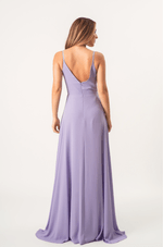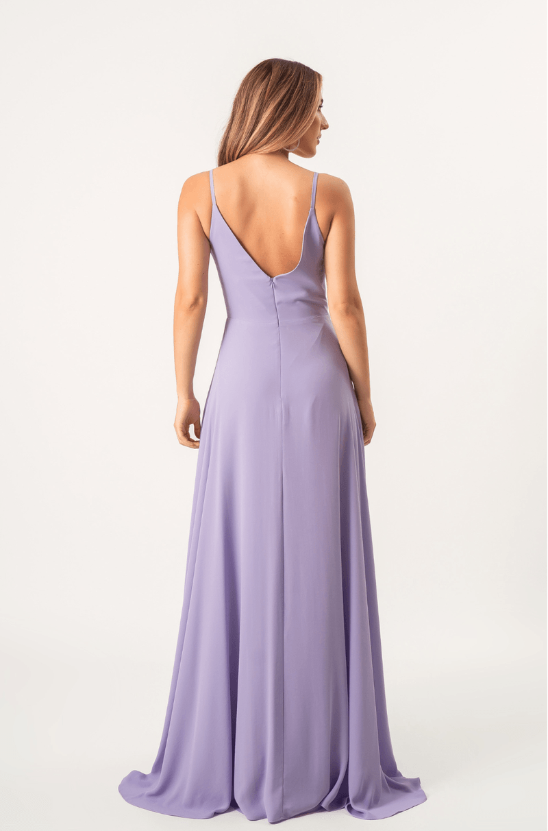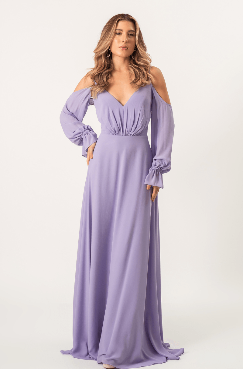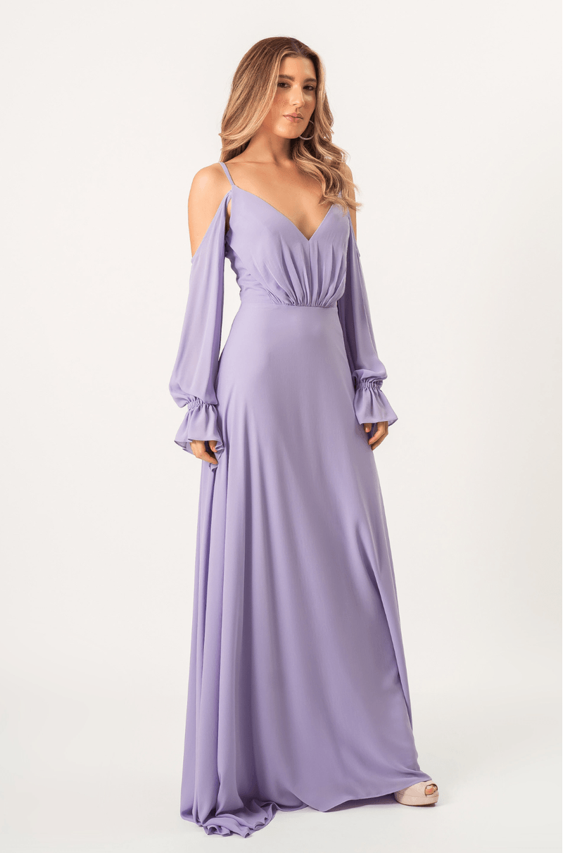 Vestido longo em chiffon com saia 180°, que garante leveza e movimento. Alças finas e mangas longas bufantes, com caimento aberto nos ombros, elástico nos punhos e acabamento com babado. O decote V aparece tanto na frente quanto nas costas, com franzido central que valoriza o busto. Zíper invisível nas costas. Ideal para festas e eventos noturnos ou entre estações.