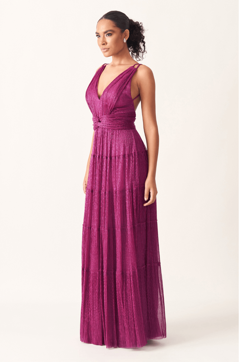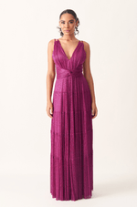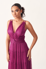 Encante em ocasiões especiais com este vestido longo confeccionado em tecido leve com fios de lurex, que proporcionam um efeito luminoso sutil e sofisticado. O busto plissado valoriza a região com um toque refinado, enquanto a faixa cruzada na cintura realça as formas, criando uma silhueta feminina e elegante.