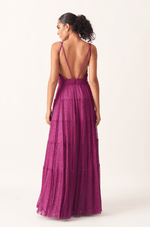 Nas costas, o design aberto com tiras finas que sustentam as alças equilibra sensualidade e leveza, conferindo um charme adicional à peça. A saia, com várias marias, oferece movimento fluido e um ar romântico, ideal para celebrar com estilo.