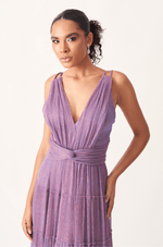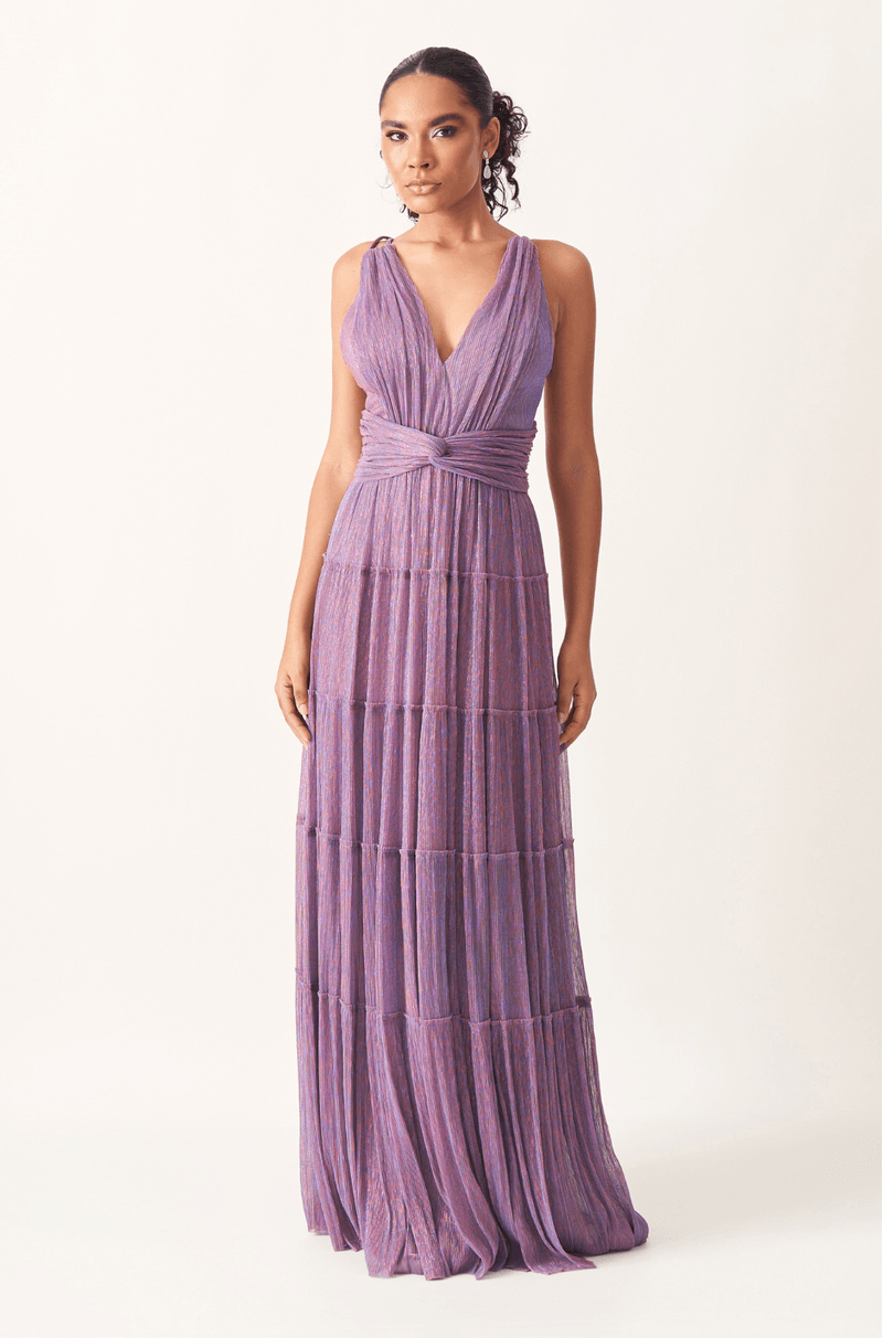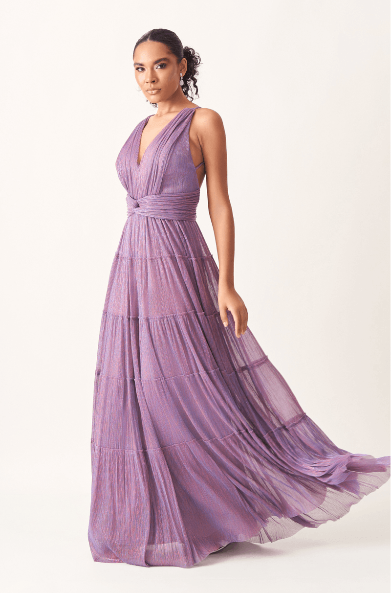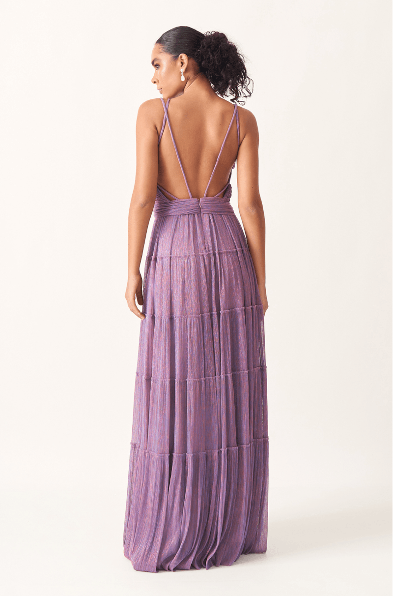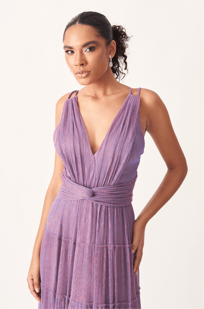 Encante em ocasiões especiais com este vestido longo confeccionado em tecido leve com fios de lurex, que proporcionam um efeito luminoso sutil e sofisticado. O busto plissado valoriza a região com um toque refinado, enquanto a faixa cruzada na cintura realça as formas, criando uma silhueta feminina e elegante.