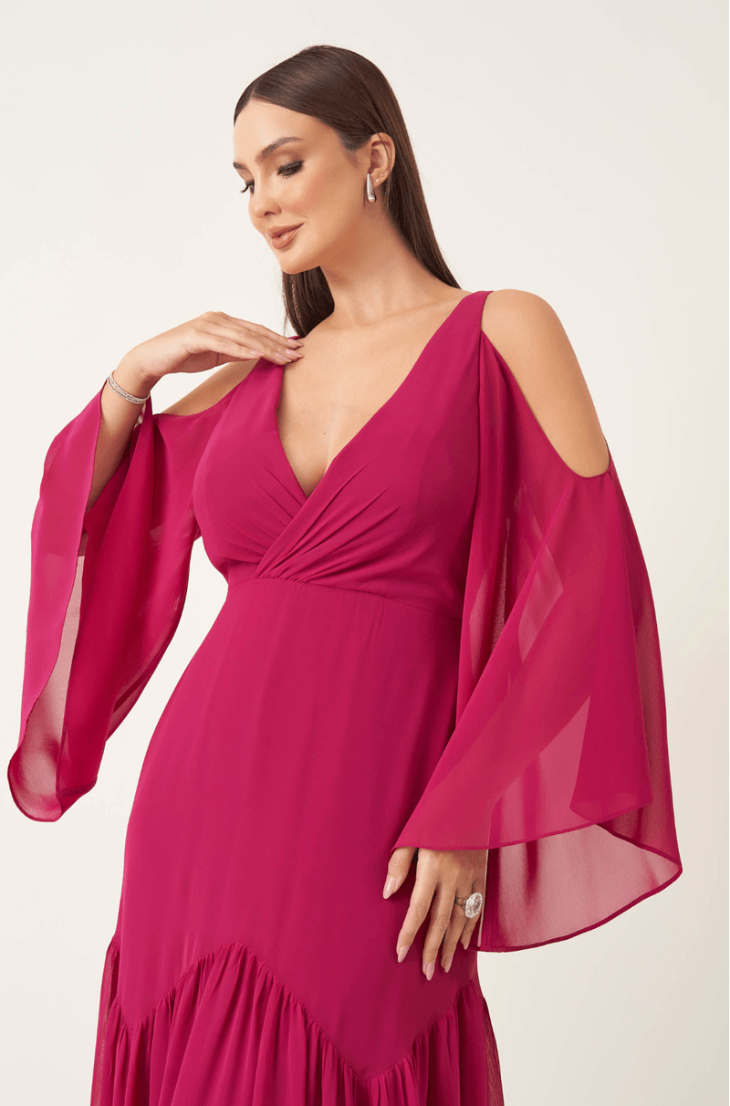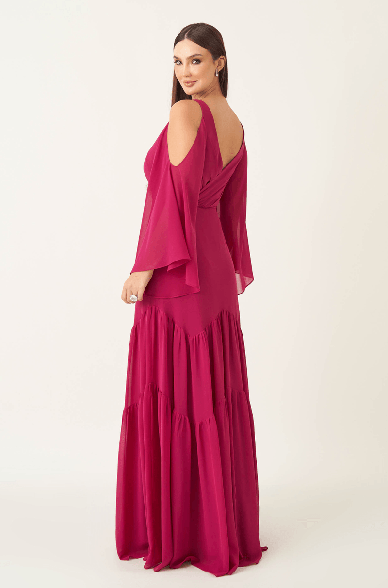 Vestido longo em chiffon com recortes assimétricos e toque romântico.