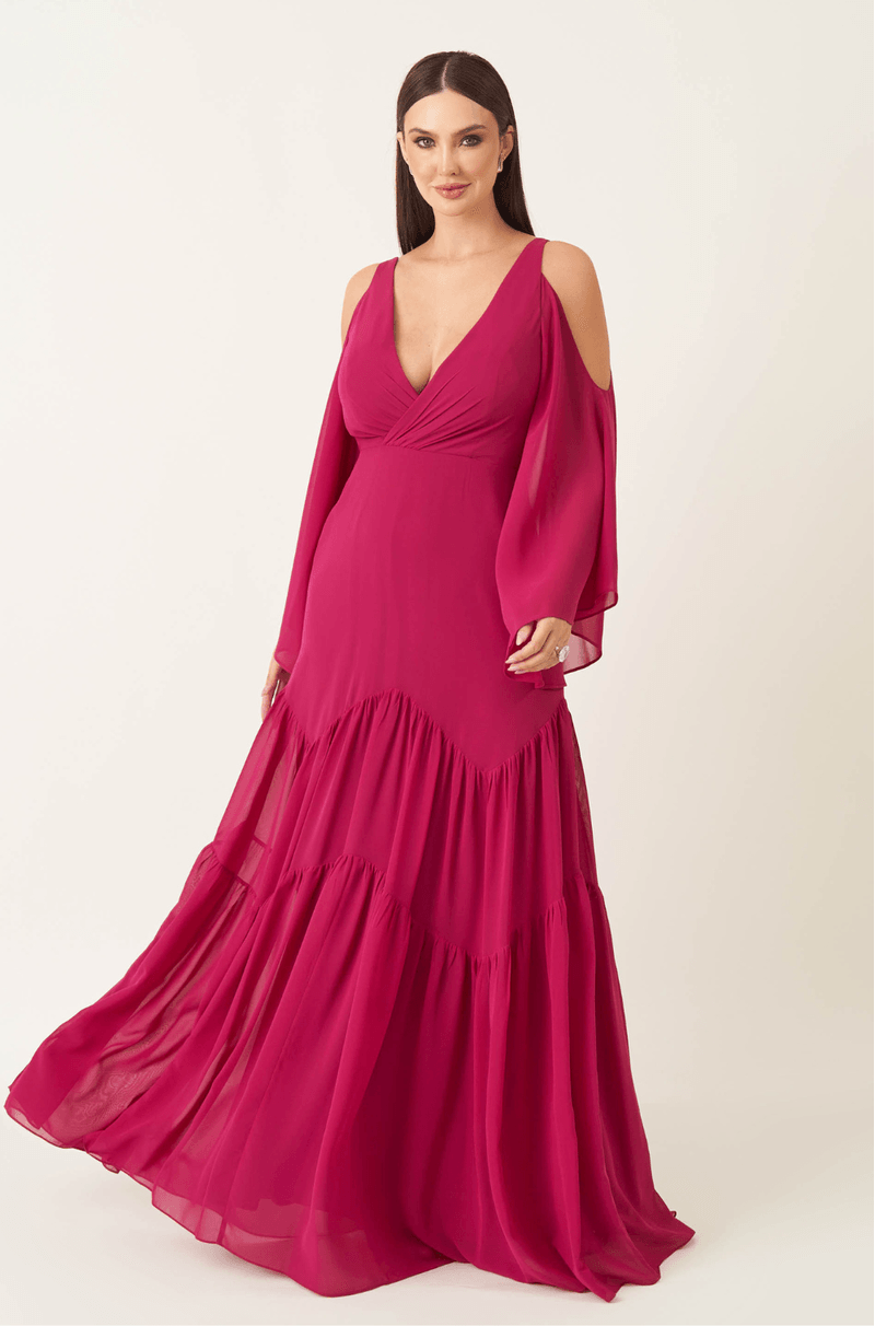Com um caimento fluido e detalhes pensados para encantar, este vestido longo traz movimento e sofisticação. A saia é estruturada em três marias com recortes assimétricos que adicionam dinamismo ao look. A parte superior tem busto transpassado com decote em V, valorizando o colo com elegância. As mangas longas com vazados nos ombros equilibram sensualidade e leveza, enquanto o zíper central nas costas garante praticidade ao vestir.