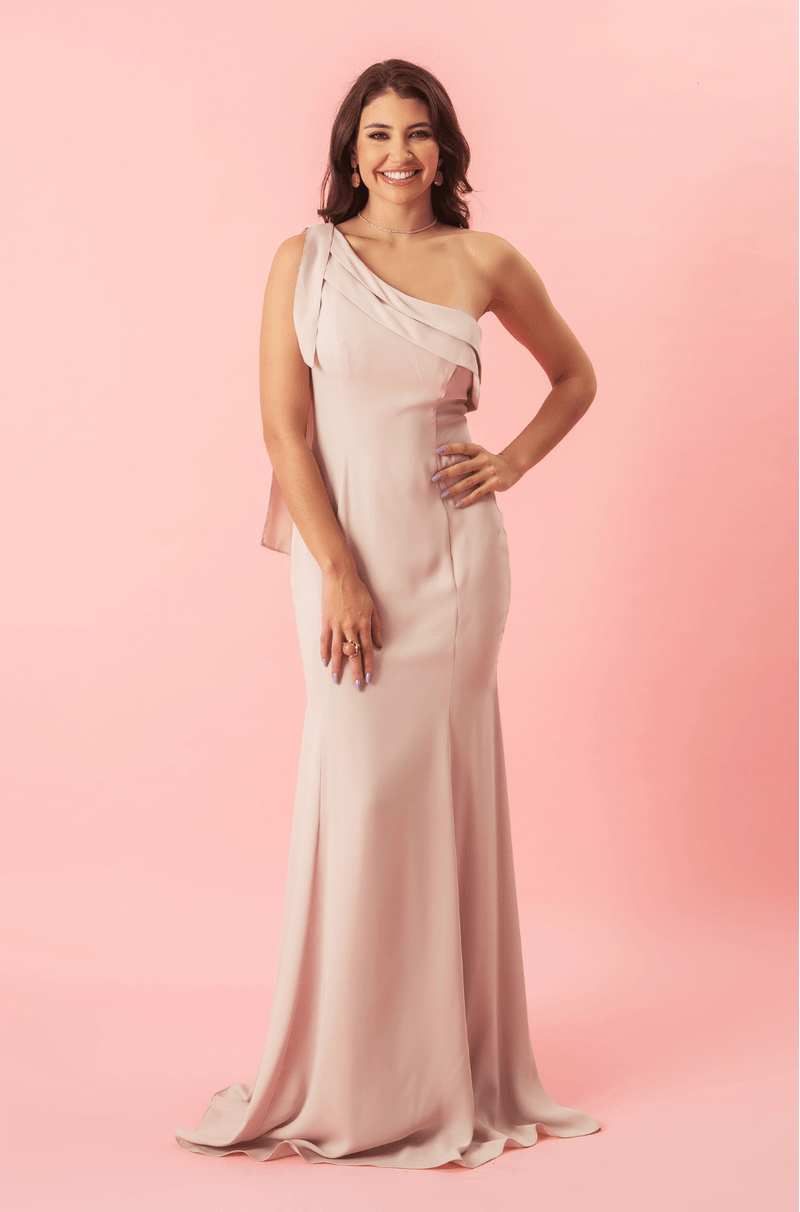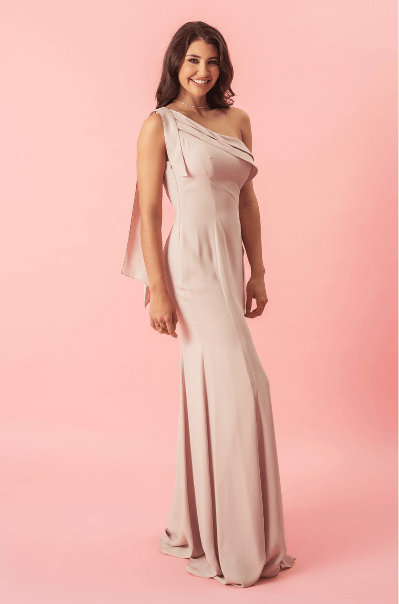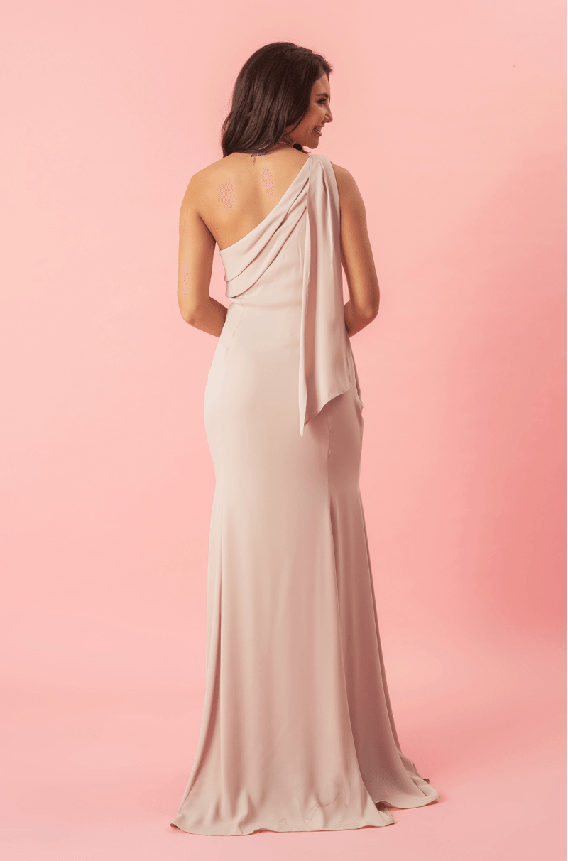Vestido longo de crepe com shape sereia e recortes estratégicos que valorizam a silhueta. Decote ombro único com tiras e sobreposições que trazem um toque moderno e elegante. A modelagem com recortes ao longo do corpo garante caimento impecável, destacando as curvas de forma sutil e sofisticada.