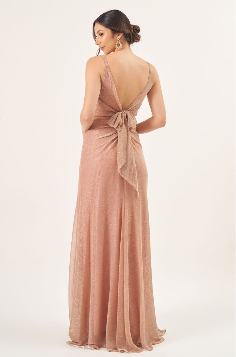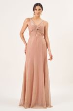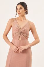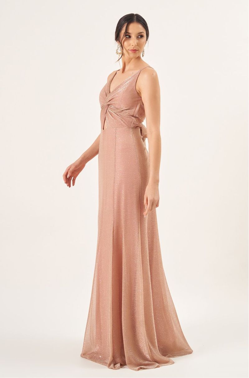Este vestido longo em lurex tem um brilho sutil e um caimento marcante que valoriza a silhueta com elegância. As alças finas e o torcido no busto criam um pequeno vazado central que deixa o visual moderno e delicado ao mesmo tempo.