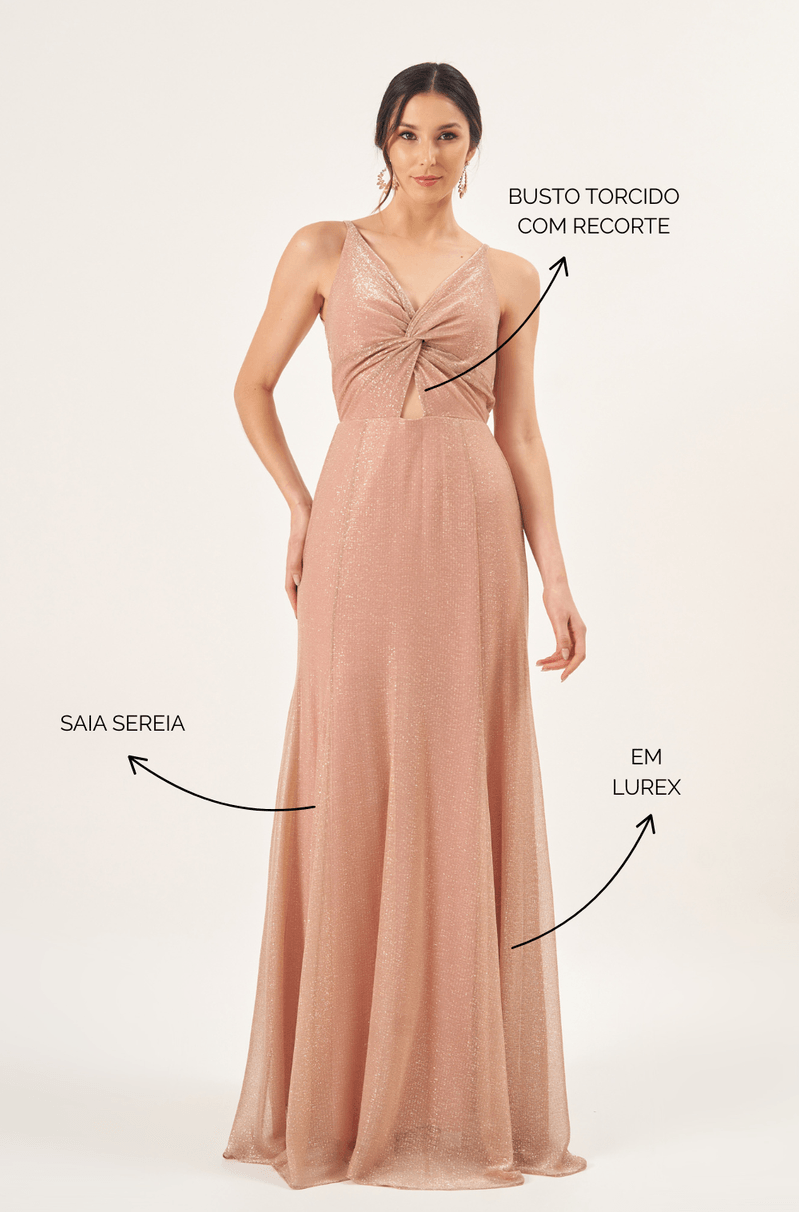 Este vestido longo em lurex tem um brilho sutil e um caimento marcante que valoriza a silhueta com elegância. As alças finas e o torcido no busto criam um pequeno vazado central que deixa o visual moderno e delicado ao mesmo tempo.