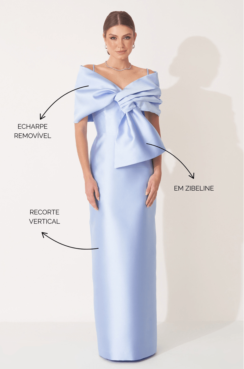 Nas costas, o zíper invisível garante um acabamento limpinho e sofisticado. E o melhor: a echarpe removível com drapeado sutil é um plus que deixa o look versátil ¿ dá para usar sobre os ombros para aquela cerimônia clássica ou amarrar na cintura para um toque moderno e descolado.