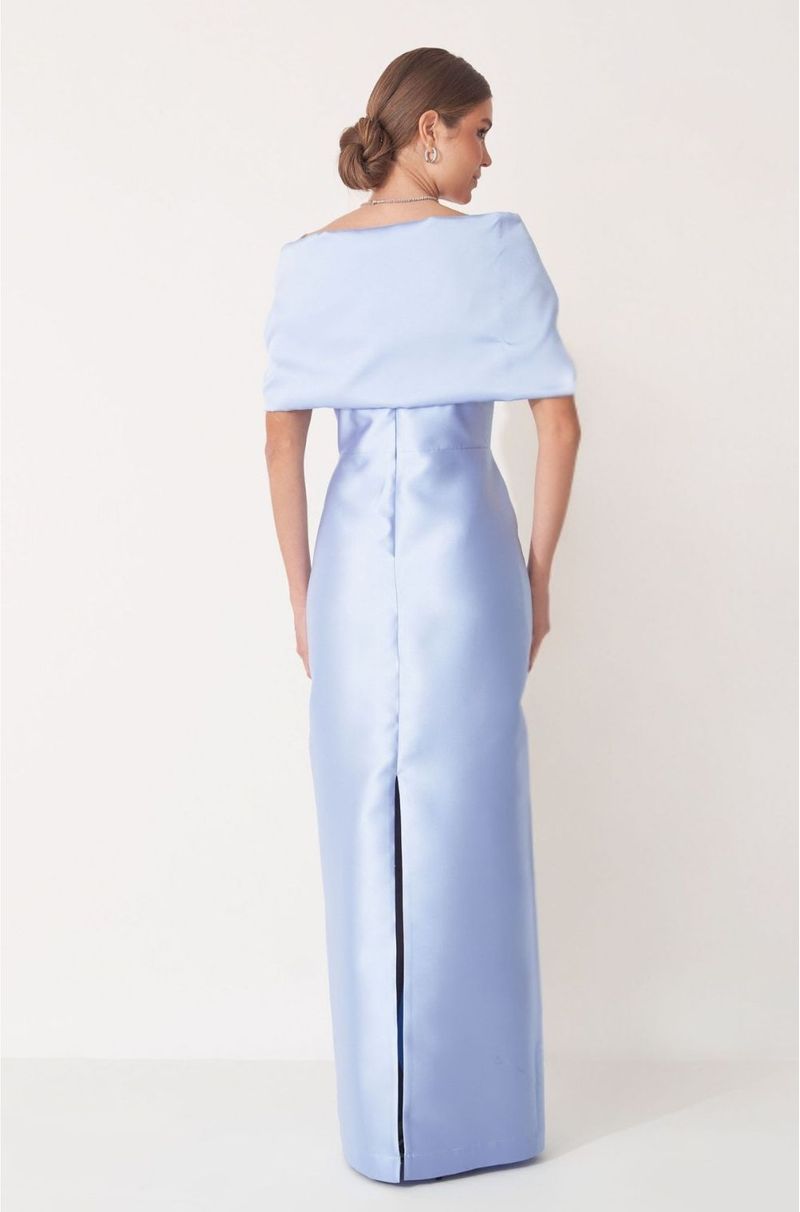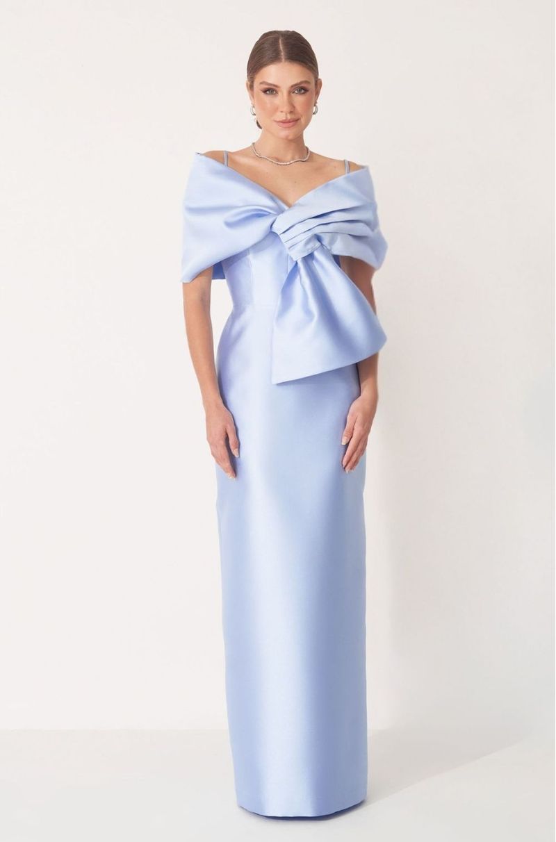 Nas costas, o zíper invisível garante um acabamento limpinho e sofisticado. E o melhor: a echarpe removível com drapeado sutil é um plus que deixa o look versátil ¿ dá para usar sobre os ombros para aquela cerimônia clássica ou amarrar na cintura para um toque moderno e descolado.