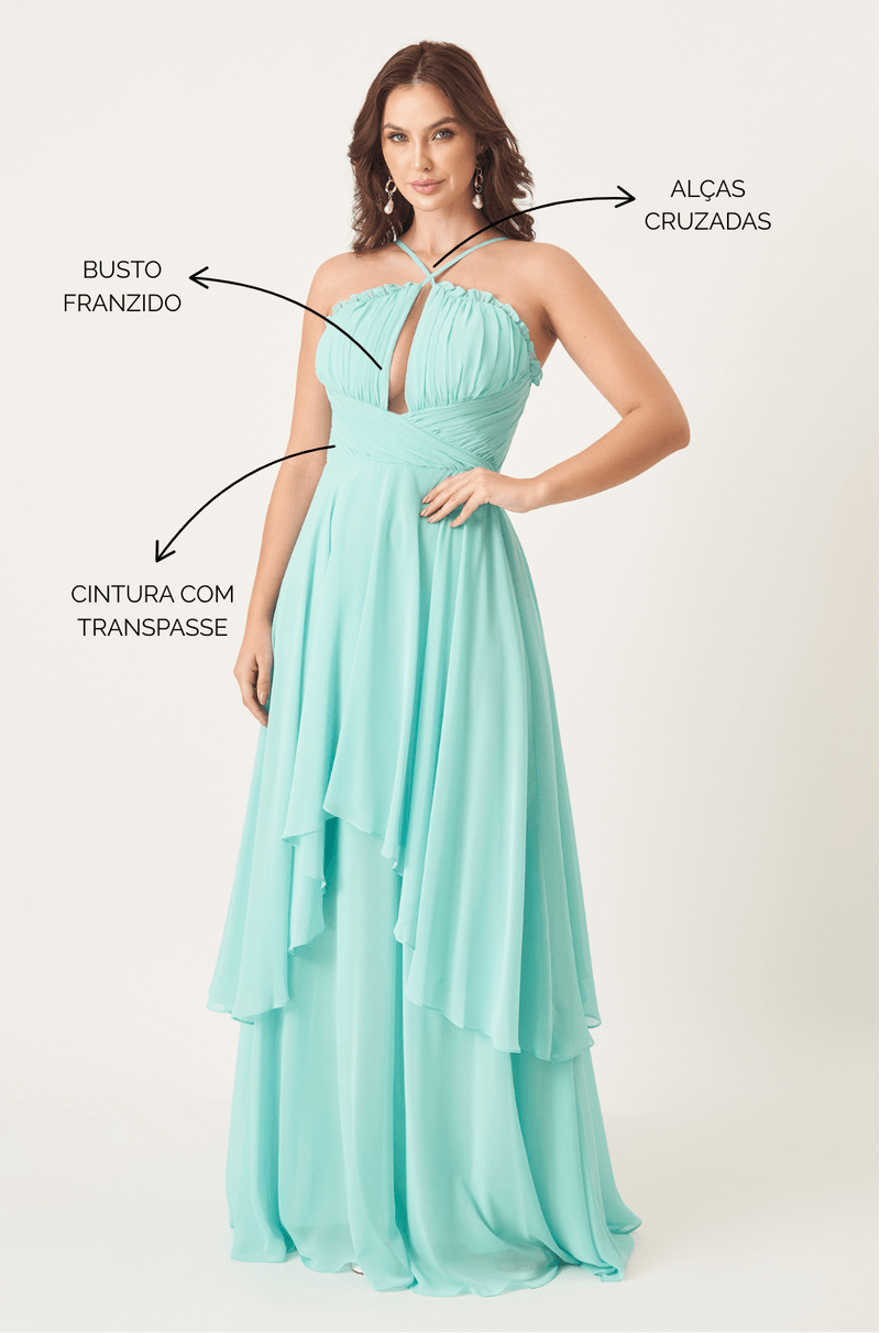 Vestido longo em chiffon, com busto franzido e delicado babado que adiciona textura e volume ao colo. As alças finas se cruzam na frente, criando um efeito envolvente no decote. A cintura é marcada por um transpasse suave que valoriza a silhueta, enquanto a saia rodada com sobreposição em camadas traz movimento e leveza ao caminhar. Um modelo que equilibra romantismo e fluidez, perfeito para casamentos ao ar livre, formaturas ou festas de verão.