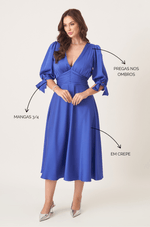 As mangas 3/4 bufantes com amarração dão um toque superfofo, enquanto os franzidos na cintura desenham o corpo com suavidade. As pregas nos ombros adicionam um volume sutil que deixa o visual ainda mais elegante. Fechamento por botão e zíper invisível garantem um caimento impecável.