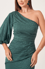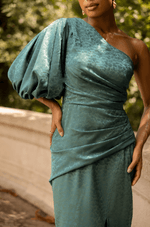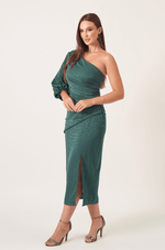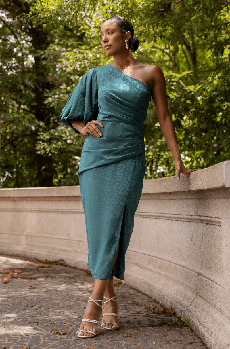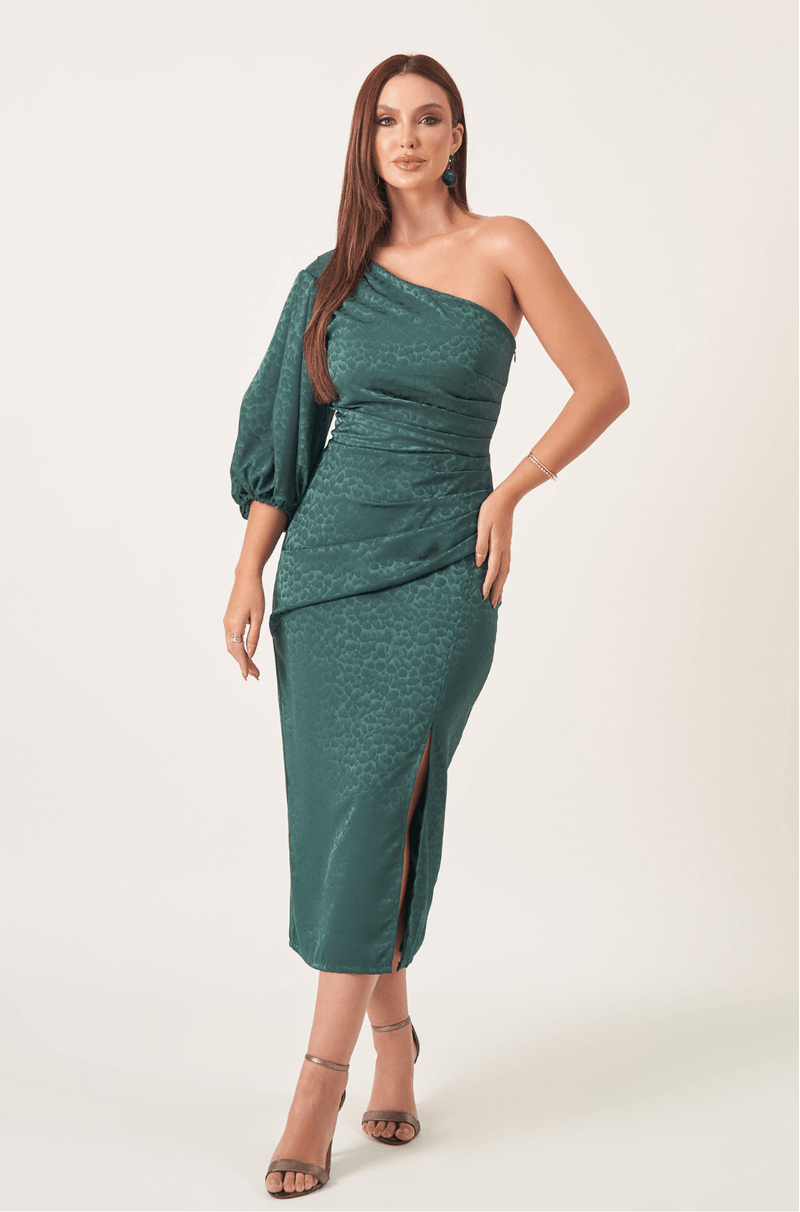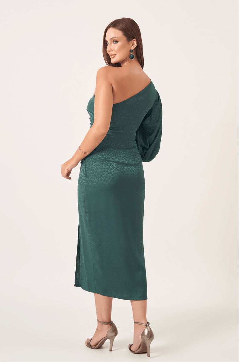 Vestido midi em jacquard estruturado, ombro único e manga bufante 3/4, que equilibra sofisticação com um toque de ousadia. O busto com pregas laterais cria volume sutil e valoriza a silhueta. A saia lápis ajustada tem fenda frontal e pregas laterais que alongam a linha do corpo. Possui zíper na lateral. Ideal para convidadas de festas ou eventos mais formais