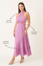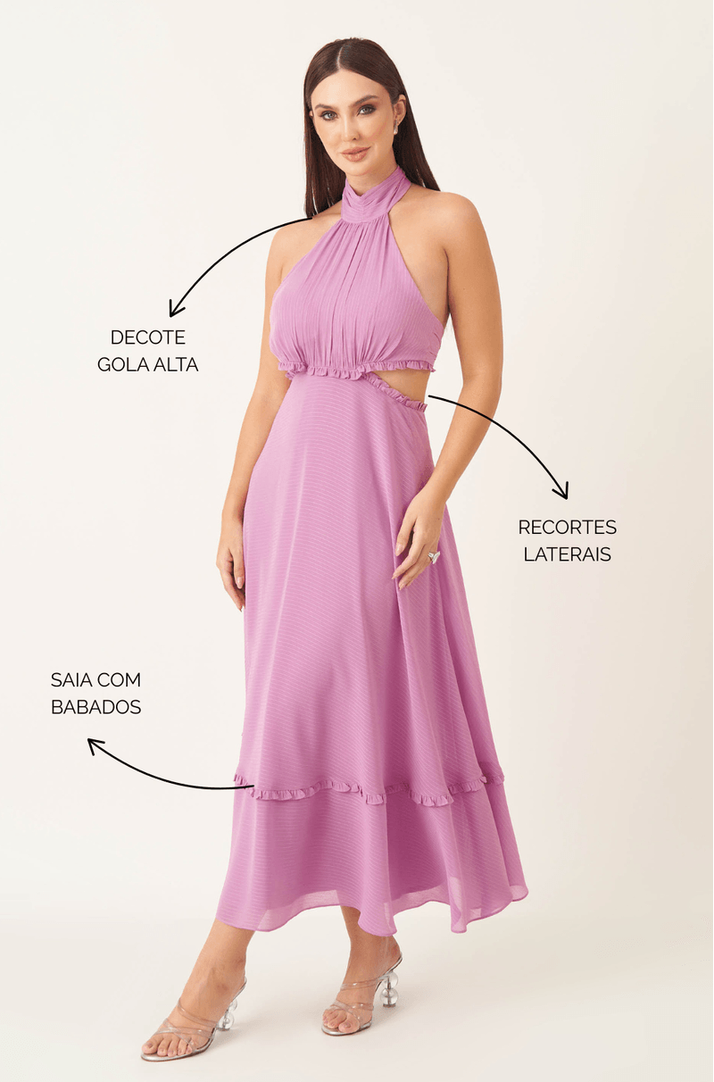 O decote tipo gola alta com franzidos suaves traz charme e equilíbrio, enquanto o busto drapeado modela sem marcar. Recortes estratégicos na cintura definem a silhueta, e a saia midi com babados sutis na barra garante movimento e leveza ao caminhar. Tudo isso em um visual refinado, ideal para eventos especiais ao ar livre ou em ambientes mais sofisticados.