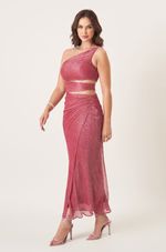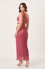 Vestido midi assimétrico em tecido plissado com fios de lurex que garantem brilho e conforto na medida. Decote ombro único com detalhes franzidos que valorizam o caimento. Os recortes laterais na cintura desenham a silhueta de forma elegante e moderna enquanto a saia com transpasse e franzidos no quadril trazem textura e movimento. Ideal para jantares especiais, aniversários e celebrações noturnas.