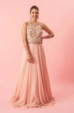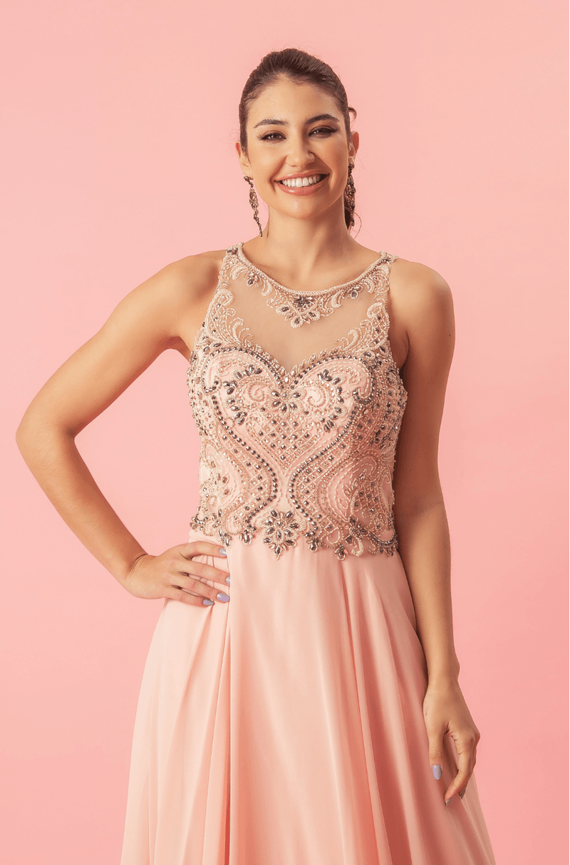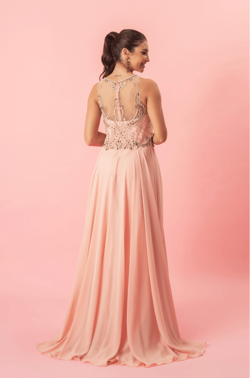 Vestido rodado Lelif possui um delicado bordado no busto, saia fluida e transparência nas costas que acompanham desenhos em pedrarias que deixam o modelo mais elegante. Use um penteado meio preso para mostrar os detalhes do vestido.